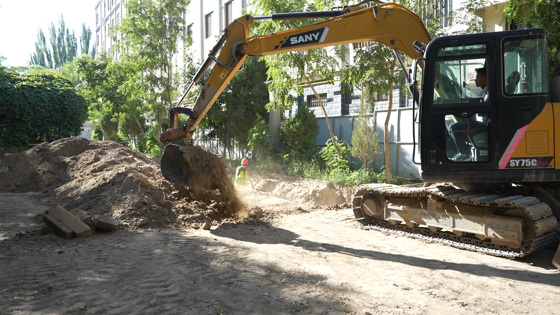 在金塔县锦绣小区更新改造项目现场,各类工程机械高效作业,施工人员正有序进行排污、供水等管网铺设的开沟砌井、清理基坑等工作。