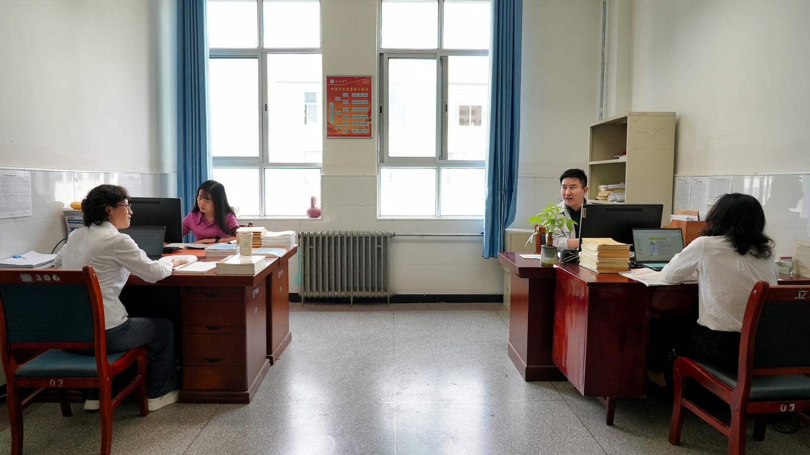 课后,她回到办公室总结教学成果,与同组的老师分享同学们的课堂表现。和她一同抵达永靖的蒋建丽老师和王海老师分别担任高一年级的英语、化学教学。初来乍到,眼前的一切都让他们觉得新鲜,“校园那颗树上的枣子什么时候成熟?班里的哪位同学是学委的最佳人选?”,这些聊不完的话题组成了他们在永靖工作生活的点点滴滴。