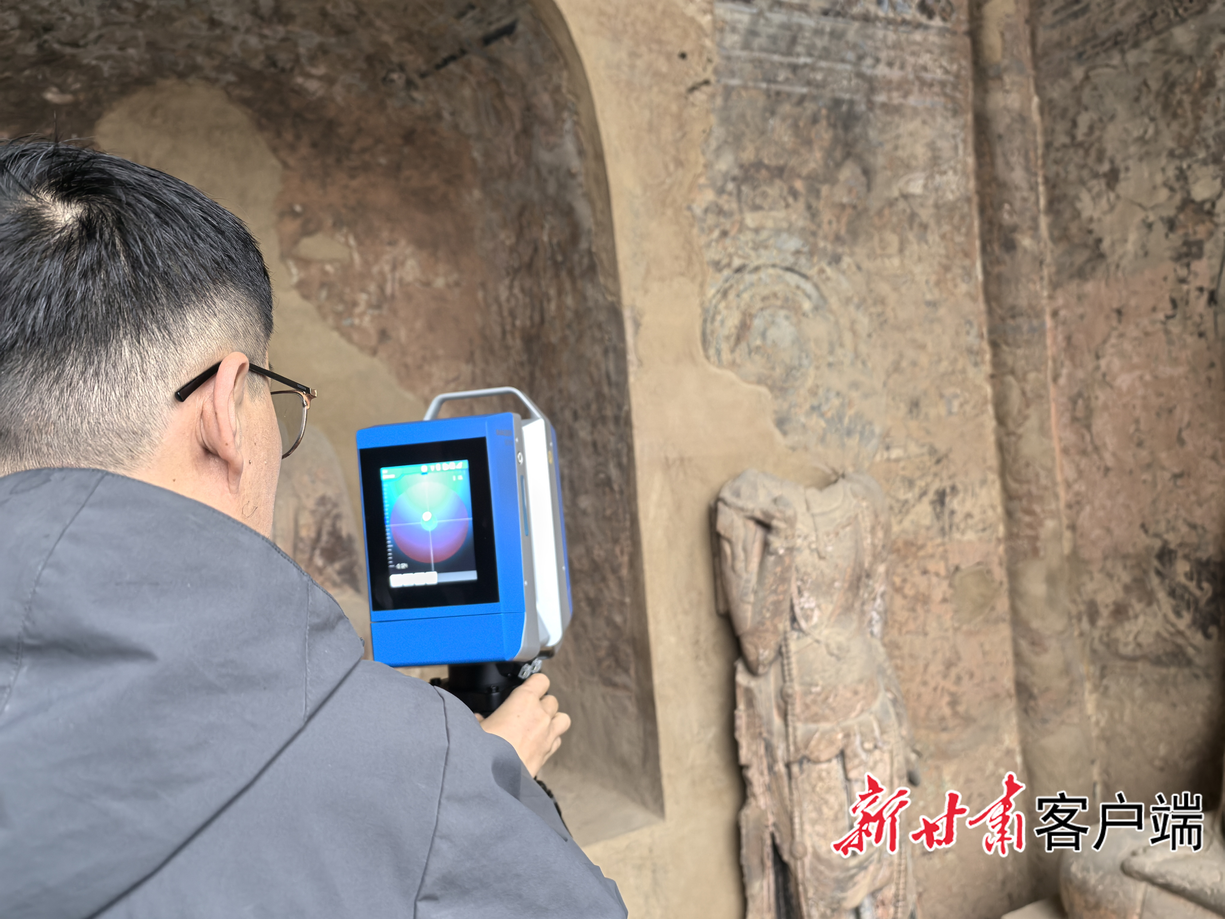 工作人员正在对麦积山石窟进行数字化采集。