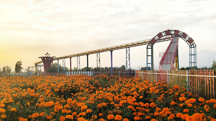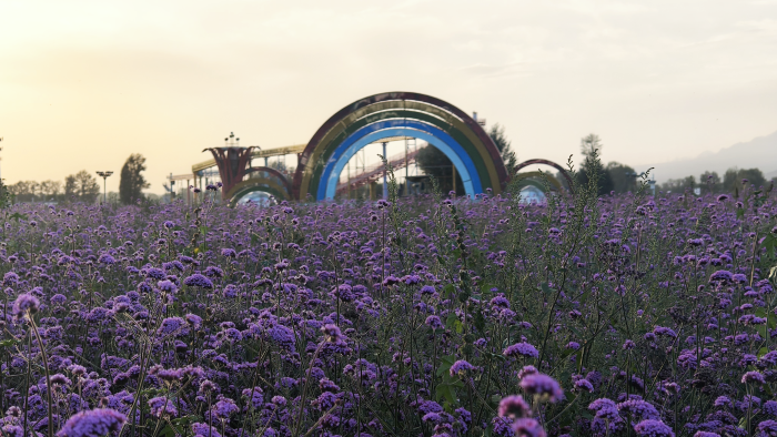 走进花海,最先撞入眼帘的是一片绚烂的色彩。粉紫色的格桑花迎着风轻轻摇晃,花瓣薄如蝉翼,沾着清晨残留的露珠,在阳光下闪着细碎的光;金黄色的万寿菊开得热烈奔放,一簇簇、一片片,像给大地铺上了一层耀眼的锦缎;还有淡蓝色的鼠尾草,连成一片朦胧的“海洋”,风过时,花穗轻轻摆动,送来阵阵清甜的香气,让人忍不住放慢脚步,沉醉在这份惬意里。
