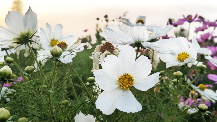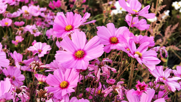九月的阳光也格外温柔,不似夏日那般灼热,透过花间的缝隙洒下来,在地上织出斑驳的光影。偶尔有蝴蝶飞过,翅膀带着斑斓的色彩,在花丛中嬉戏;蜜蜂“嗡嗡”地忙着采蜜,为这片花海增添了几分灵动的生机。远处的天际线是淡淡的蓝,与近处的花海相映成趣,抬头望去,仿佛整个世界都变得轻盈起来。