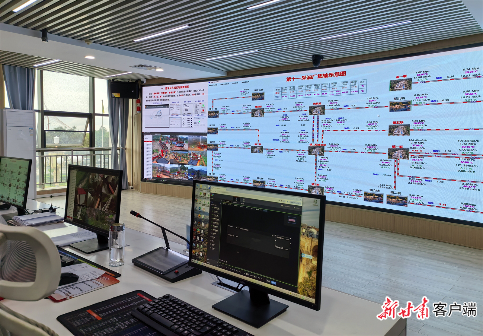 在指挥中心大厅记者看到,采油厂集输示意图清晰地呈现在大屏幕上,工作人员正对各个生产环节进行数字化在线实时指挥调度。