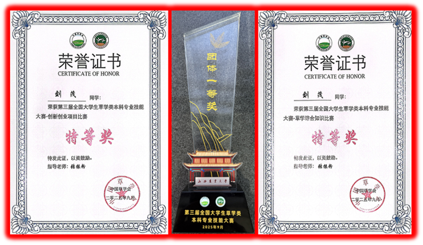 在个人项目中,副教授肖红获青年教师授课比赛一等奖,刘茂将获“创新创业项目”特等奖(排名1/28)和“草业技能知识竞赛”特等奖(排名4/112),韩秉哲同学获“草业技能知识竞赛”一等奖,申芳溟同学获“植物标本制作”一等奖及“草业技能知识竞赛”二等奖,向筱涵同学获“种子净度分析”和“草业技能知识竞赛”二等奖。
