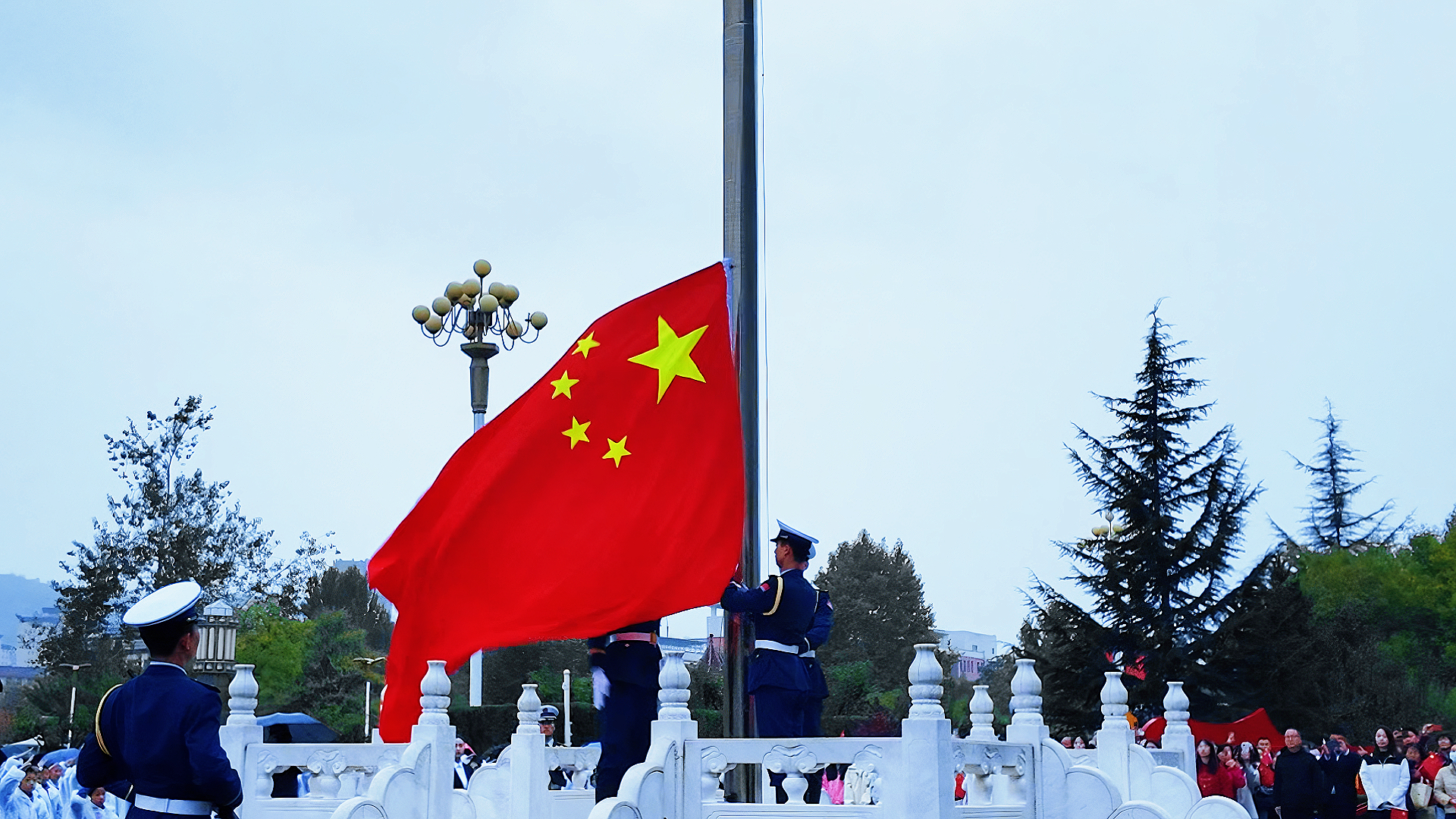 伴随着雄壮激昂的《义勇军进行曲》,升旗手迎风振臂,五星红旗在晨曦中冉冉升起,迎风飘扬。全场人员齐声高唱国歌,向伟大祖国致以最崇高的敬意和最深情的祝福。