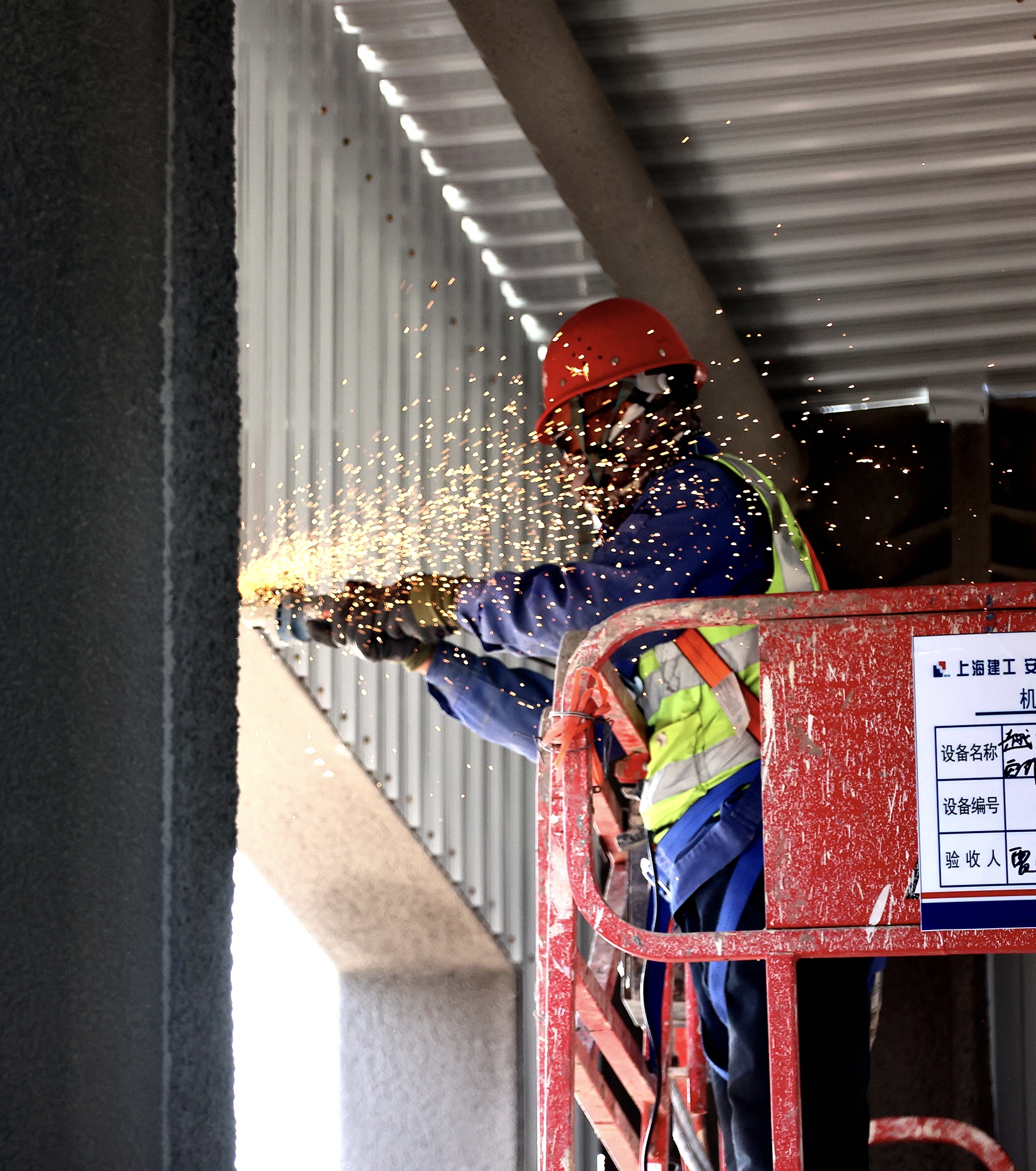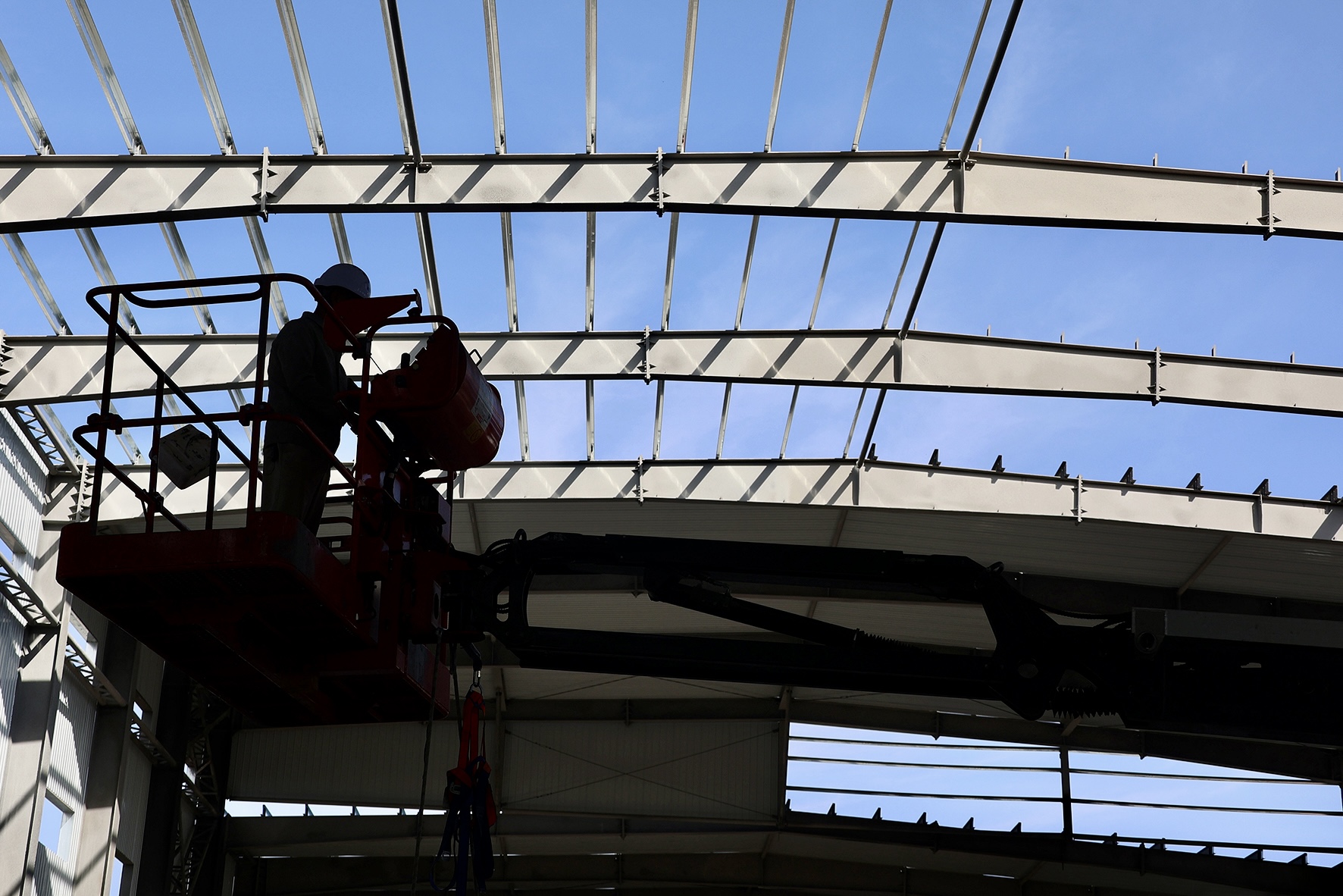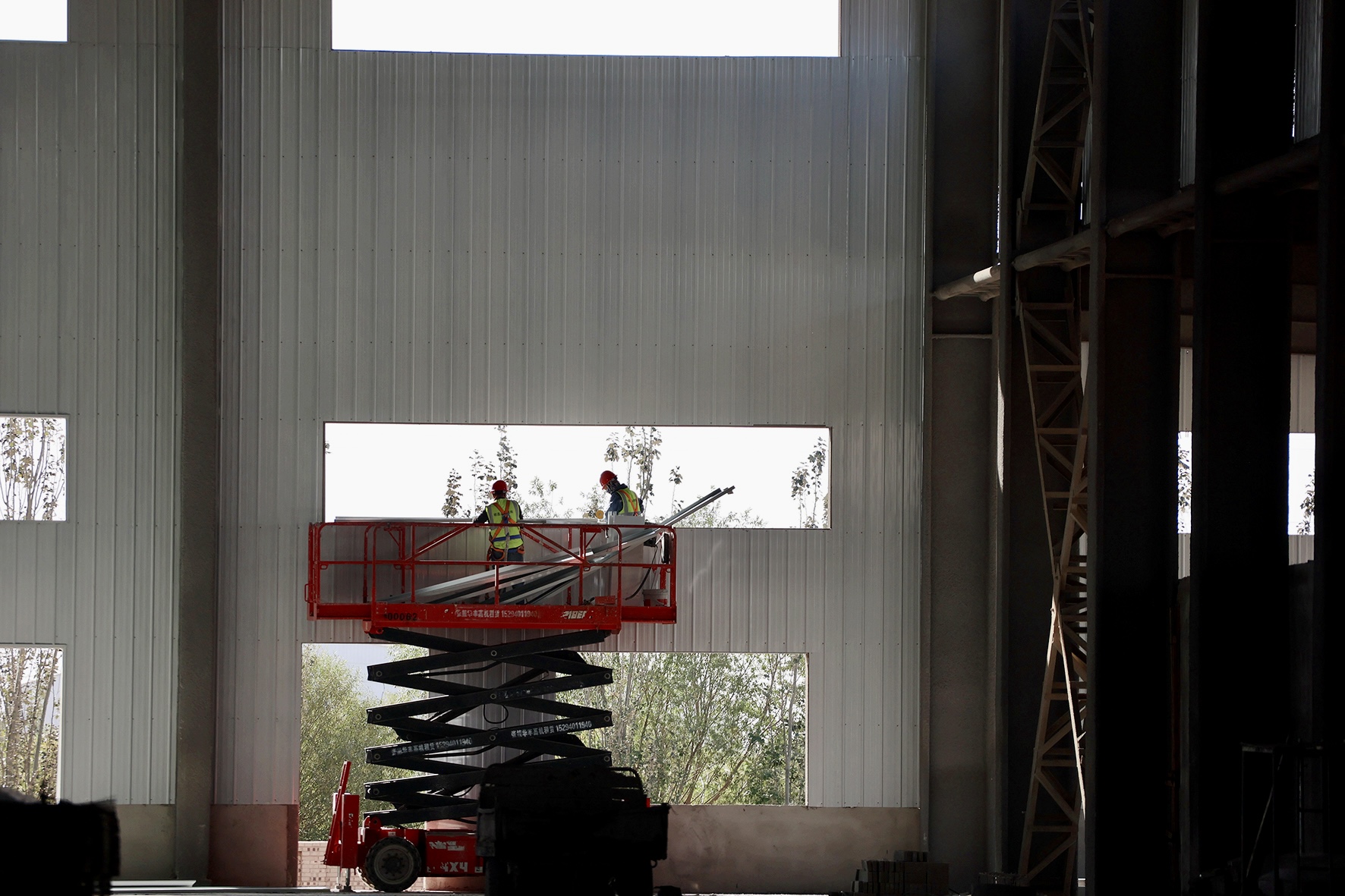 在张掖市经济开发区甘肃纳塔新材料有限公司碳化车间作业现场,曲臂式、剪叉式升降机等6台高空作业车正井然有序运转,机械臂一伸一展间,将建筑工人们平稳托举至数十米高空。工人们在高空作业平台上专注作业——焊接钢架、连接螺栓……正一丝不苟地为这座巨型钢铁骨架填充“血肉”。