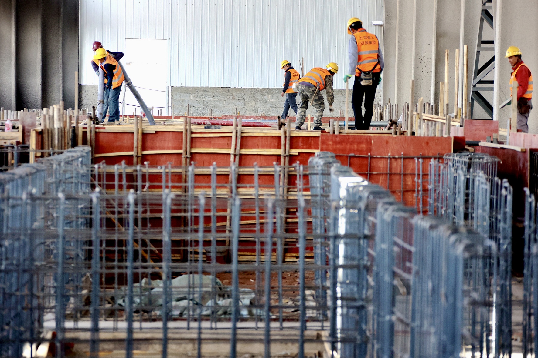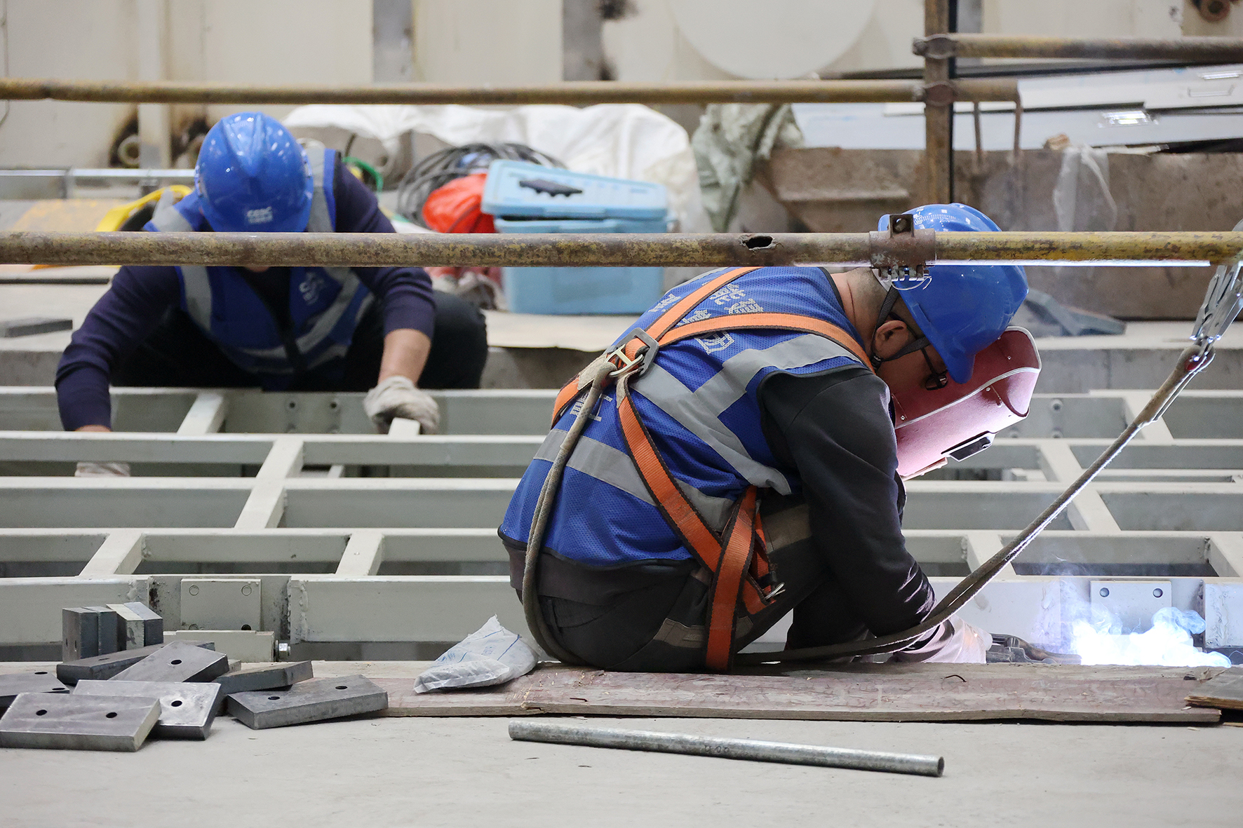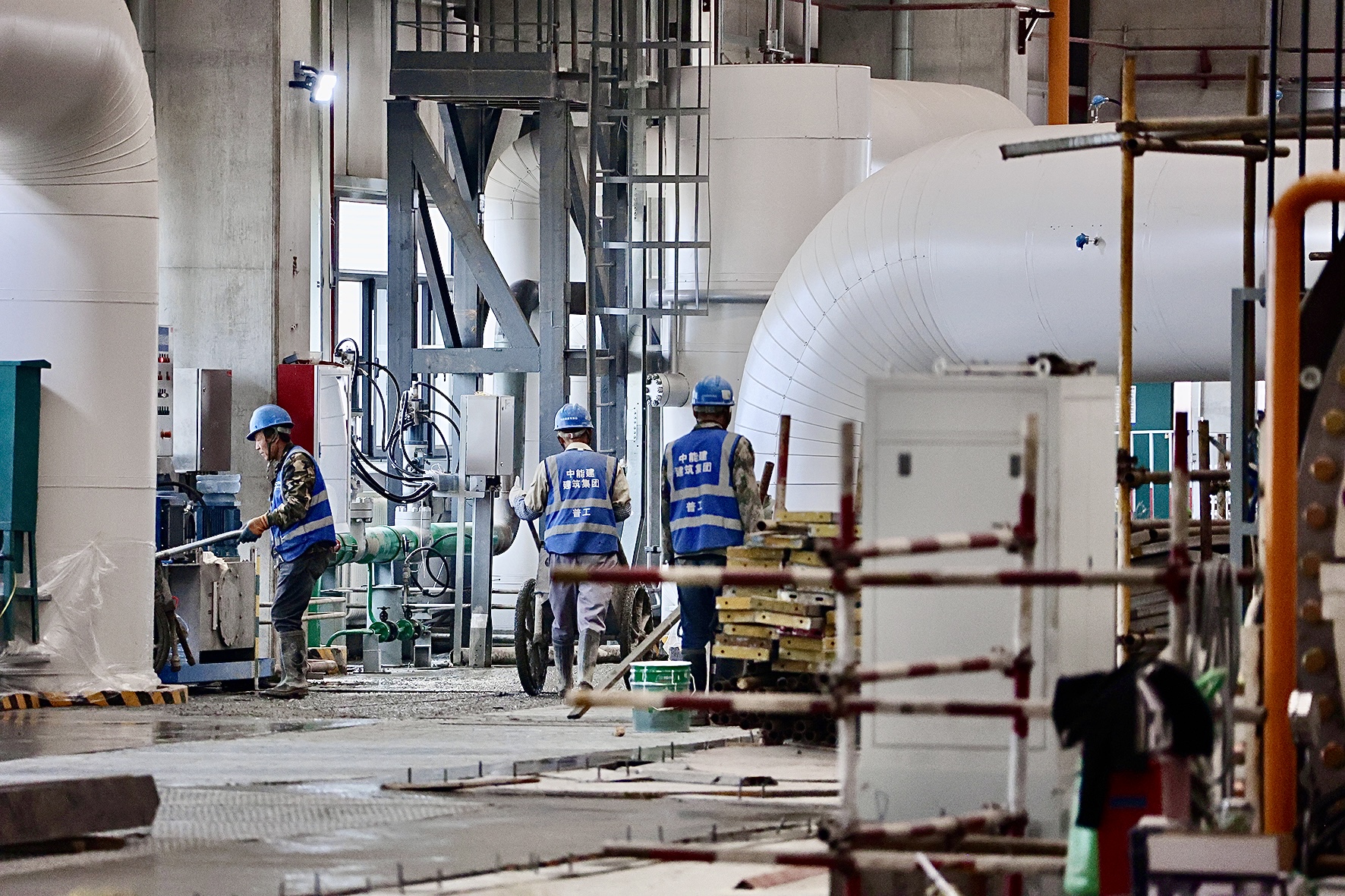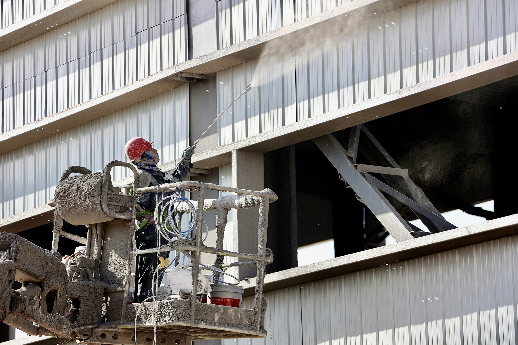在张掖市经济开发区甘肃纳塔新材料有限公司碳化车间作业现场,曲臂式、剪叉式升降机等6台高空作业车正井然有序运转,机械臂一伸一展间,将建筑工人们平稳托举至数十米高空。工人们在高空作业平台上专注作业——焊接钢架、连接螺栓……正一丝不苟地为这座巨型钢铁骨架填充“血肉”。