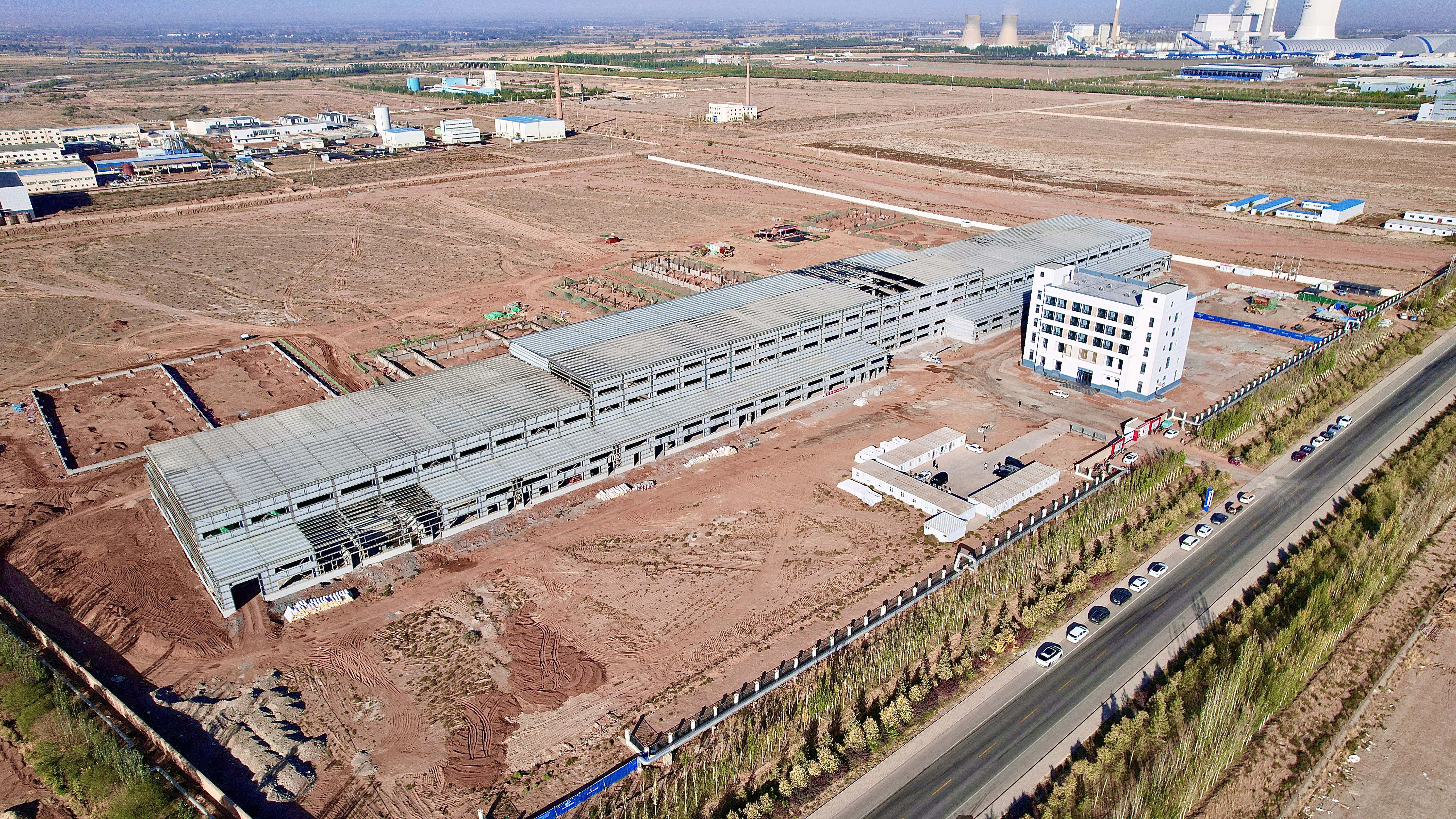“1#碳化车间已完成主体钢构,其中一条碳化线设备基础已完成,预计在国庆节后开始安装设备。综合动力站、循环水站、空压间、原丝库成品库等公辅工程已完成基础建设。整体项目预计在2025年12月底进行试生产。假期我们全体建设人员将不停工不停产,确保各项施工节点如期完成。”甘肃纳塔新材料有限公司副总经理郭品铧介绍。