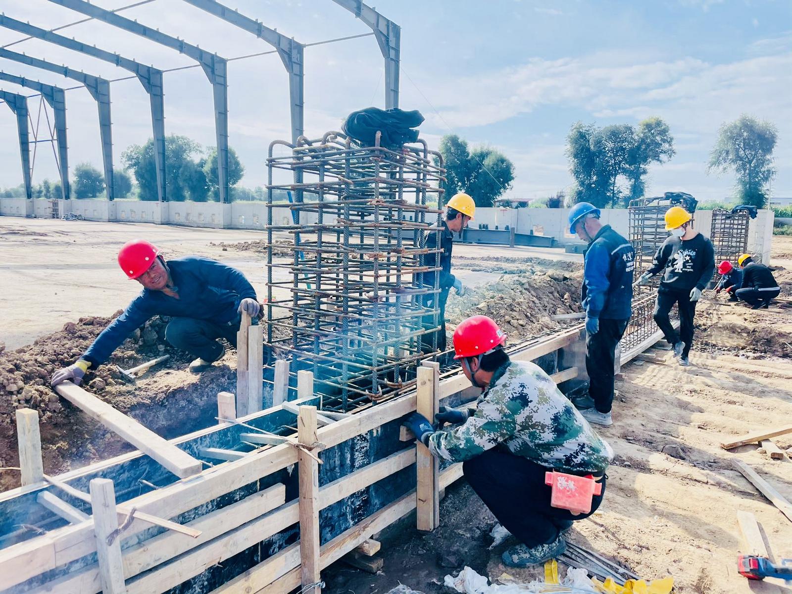走进项目现场,一片火热的施工景象映入眼帘。工人们在楼承板上专注地进行钢筋绑扎,5号厂房区域房心土回填作业正有条不紊地开展,地梁旁钢筋绑扎工序精准推进。另一侧,人行道砖铺设的整齐划一,绿化种植也在同步进行,为园区增添了一抹生机。各作业面的建设者们干劲十足,全力推动项目向既定节点迈进。