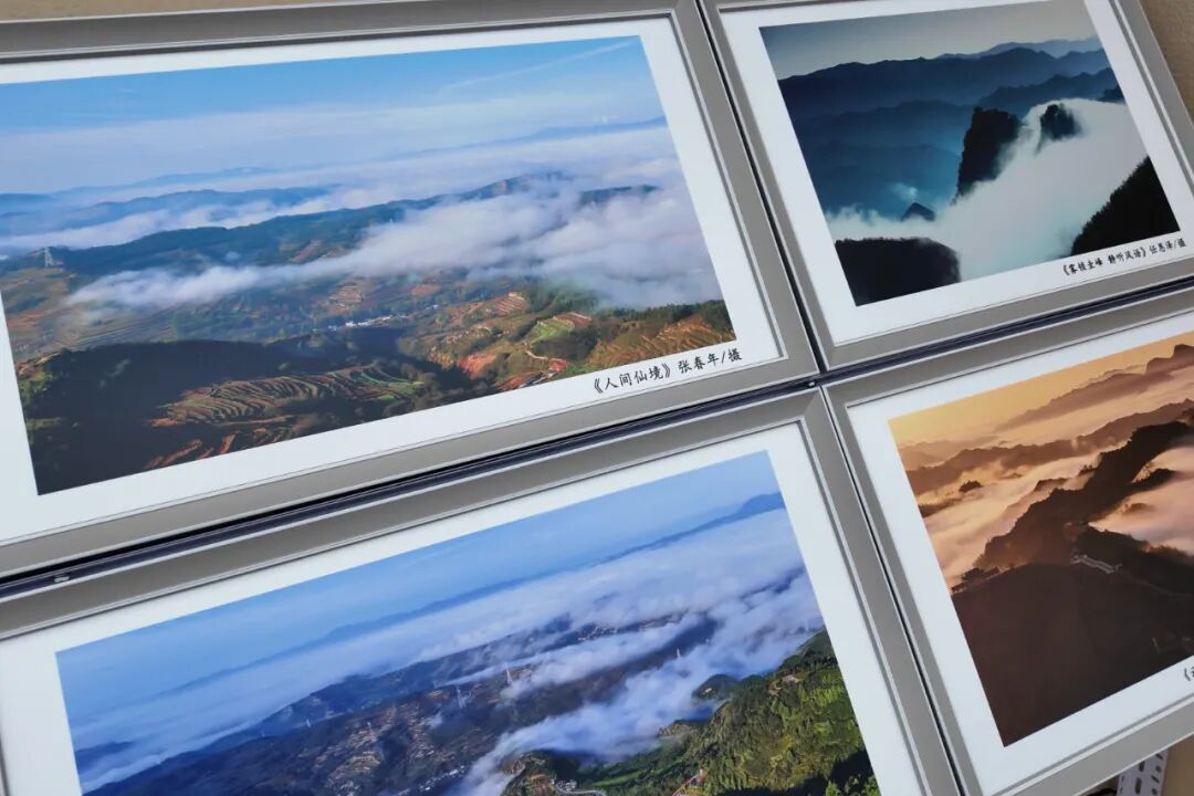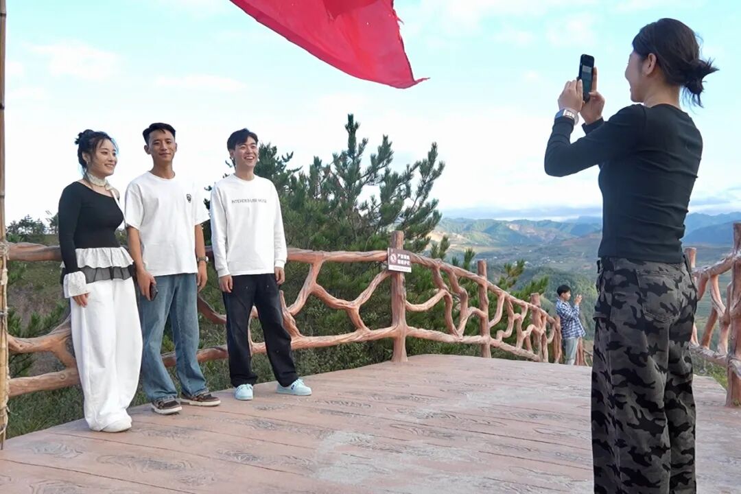 清晨的云华山云雾缭绕,红叶与青松相映。悬空栈道上系满祈福丝带,与卡通打卡点共同点缀出节日气息。游客们或拍摄云海,或合影留念,山间欢声笑语不断。云华山风光摄影展也吸引众多摄影爱好者驻足。