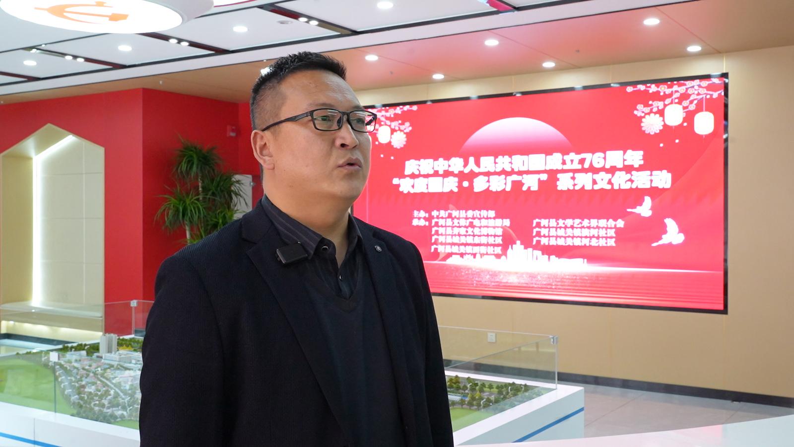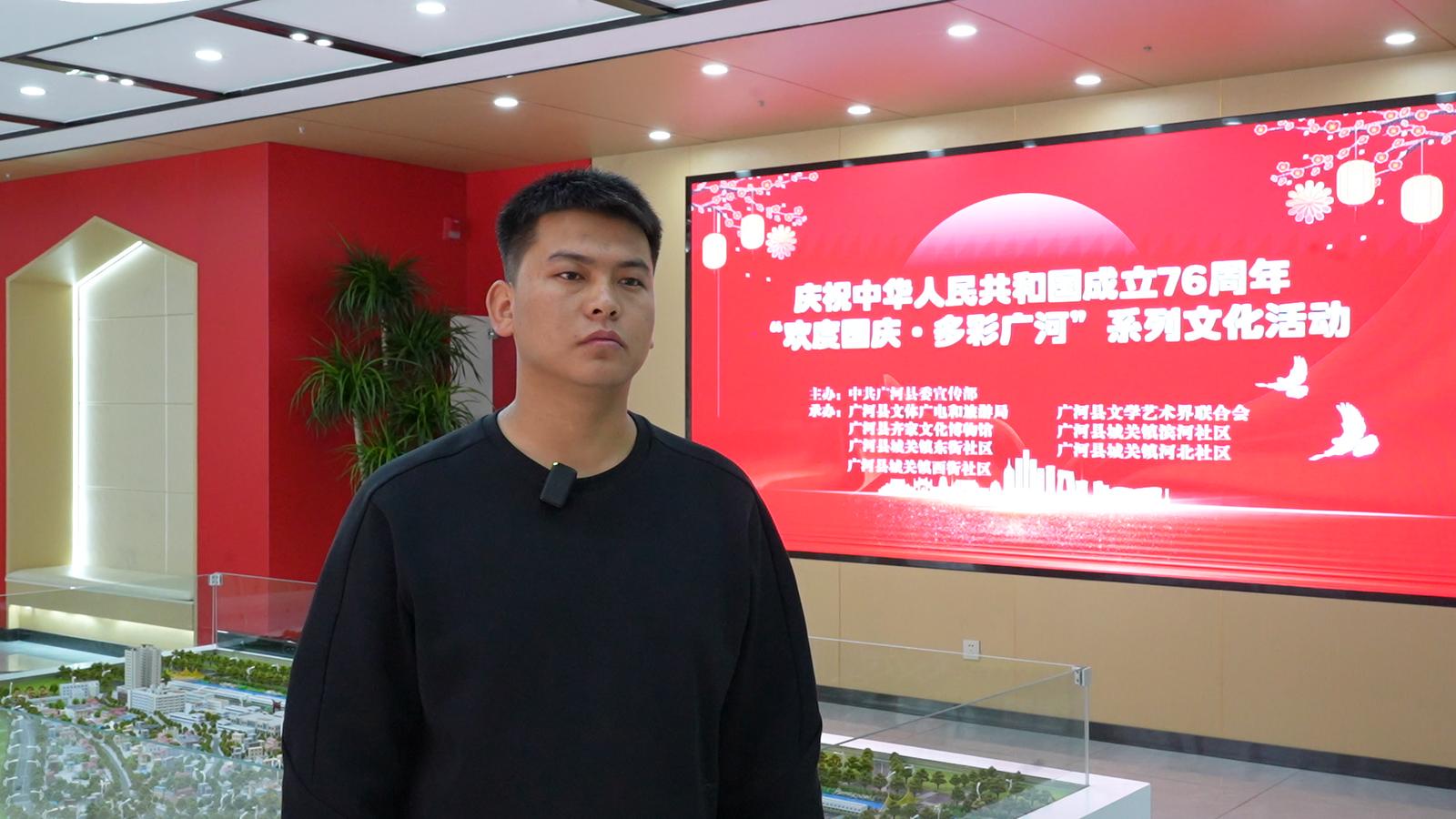 滨河社区群众 马纯:这次活动内容十分丰富,有剪纸、书法、绘画还有其他一些非遗作品,让我深刻的感受到了我们中华文化的博大精深,借此国庆佳节之际,祝愿我们的祖国的繁荣昌盛。