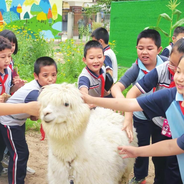 “哇!是羊驼!它的毛好软啊!”动物园“萌宠天团”刚一亮相,就引来同学们阵阵欢呼。趣味课堂上,同学们了解到小浣熊“洗手”的科学原理,观察了树懒、长颈鹿等动物的粪便标本,通过互动问答学习动物保护知识。最受欢迎的户外互动环节中,温顺的羊驼、灵动的白狐和可爱的柯尔鸭成了孩子们的“明星伙伴”,他们在抚摸、喂食和观察中,感受着与动物相处的快乐。