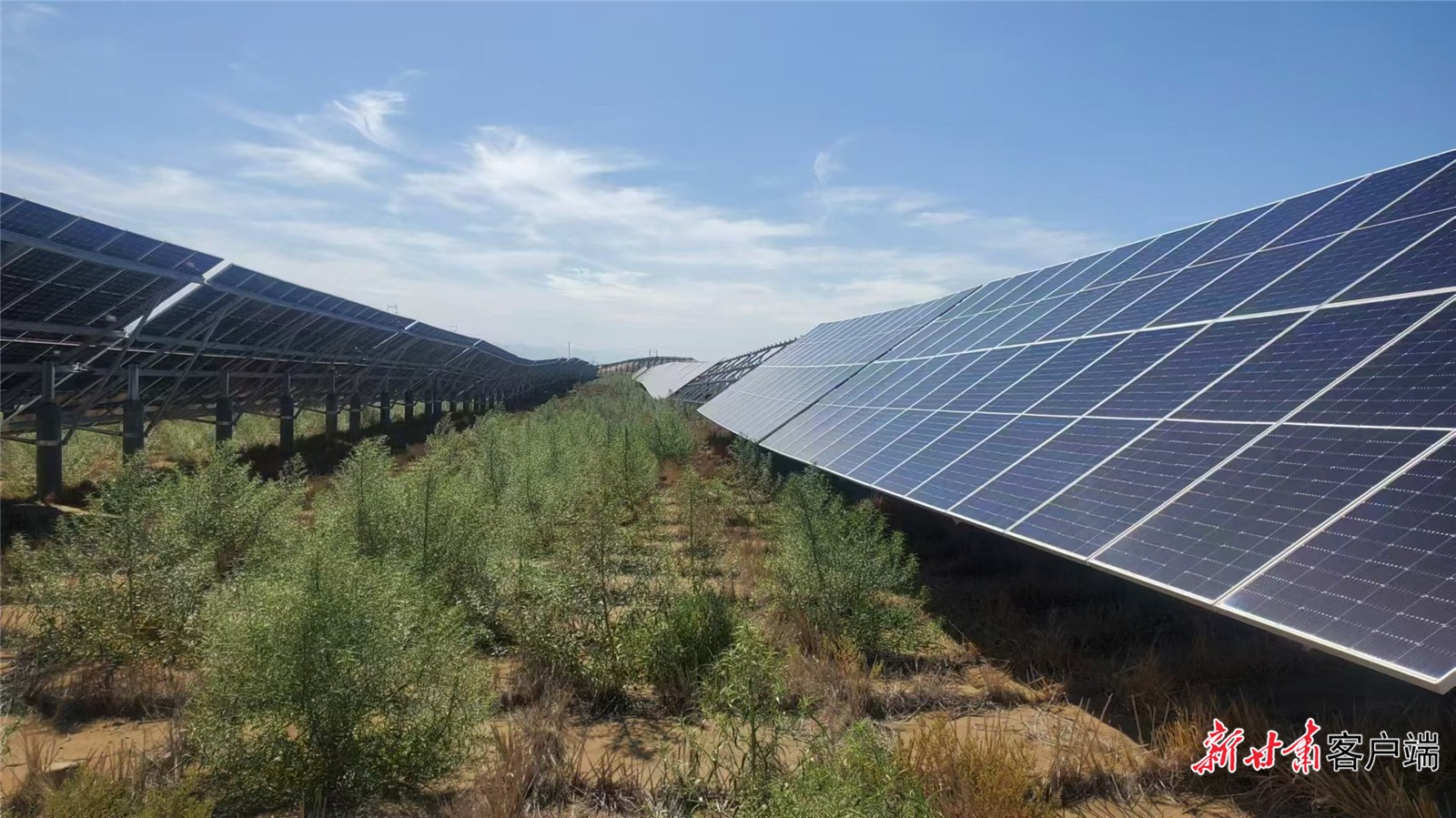 依托改善后的基底条件,甘肃电投酒汇公司在项目基地种植了柠条、花棒、梭梭草等多种沙生植物及耐荫作物,逐步形成永久植被覆盖,最终实现“板上发电、板下治沙”。