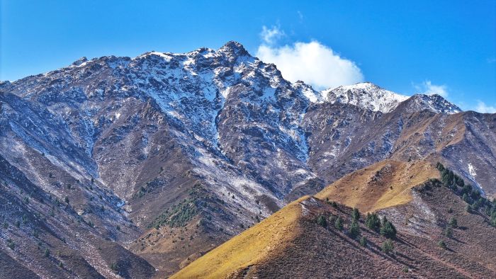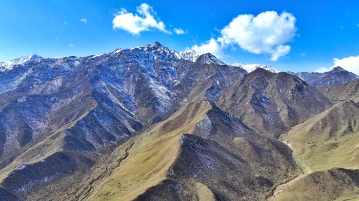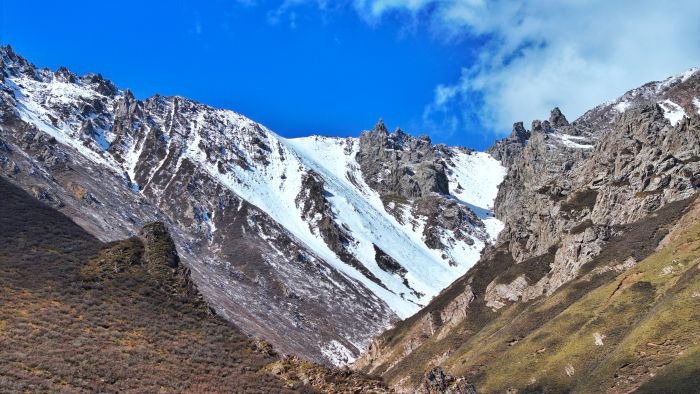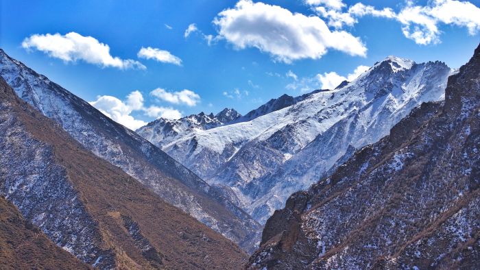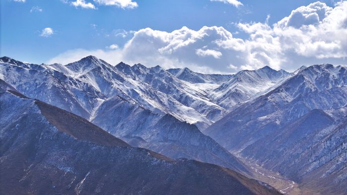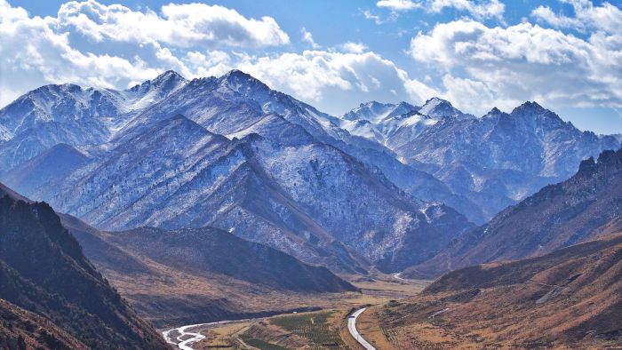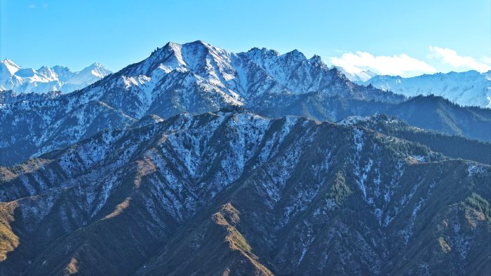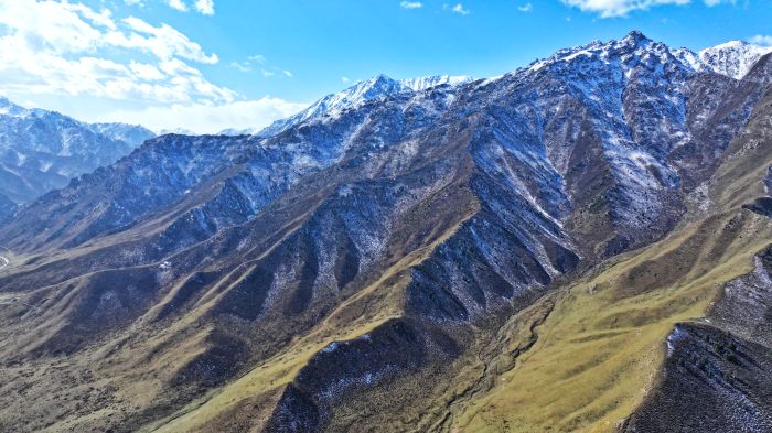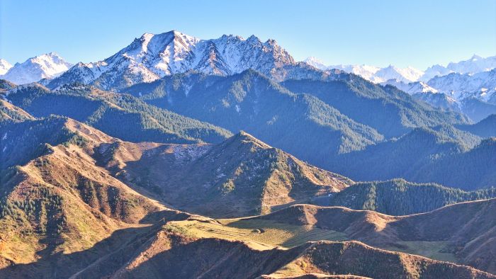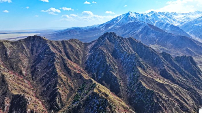 近日,在澄澈蓝天的映衬下,甘肃省张掖市民乐县扁都口境内的祁连山脉连绵起伏,如巨龙盘踞大地。部分山峰被皑皑白雪覆盖,在阳光照耀下,冰雪闪烁着耀眼的银光,与裸露的深褐、灰绿山体相互交织,层次分明,勾勒出刚劲而又不失灵动的轮廓,仿佛一幅大气磅礴的山水画卷在天地间徐徐铺展。