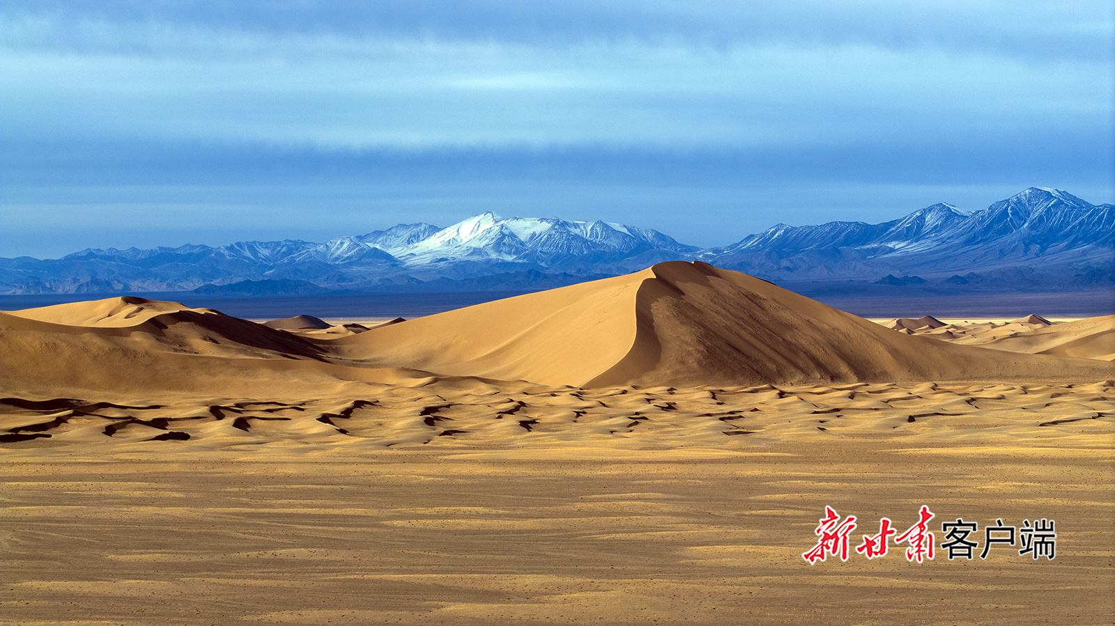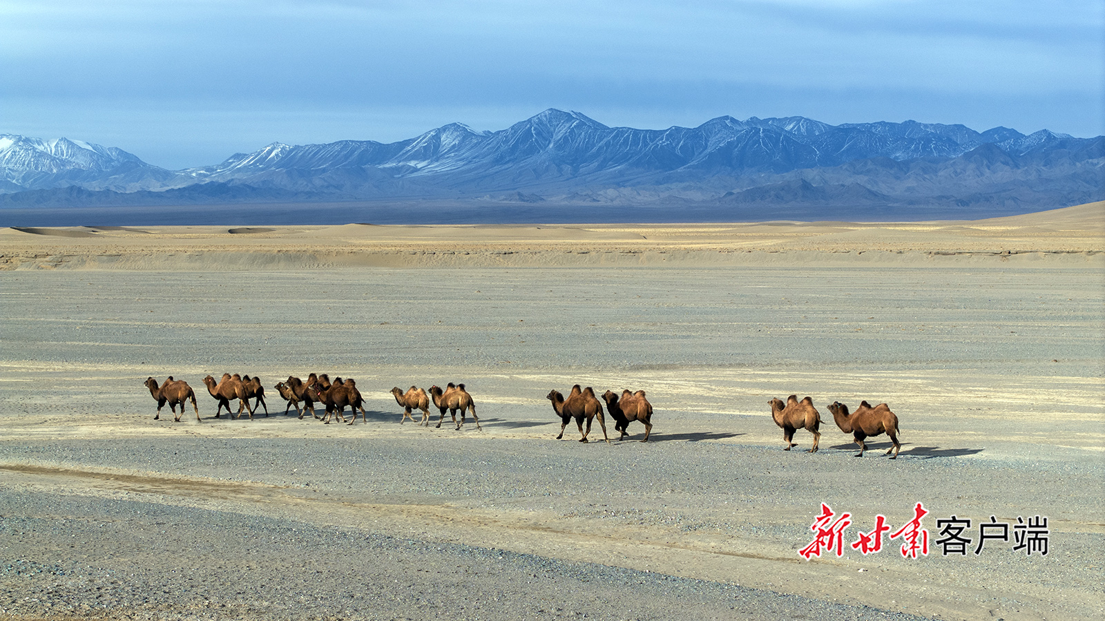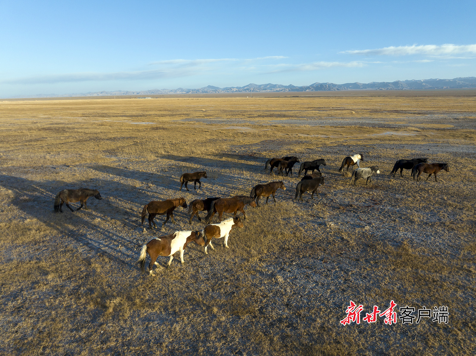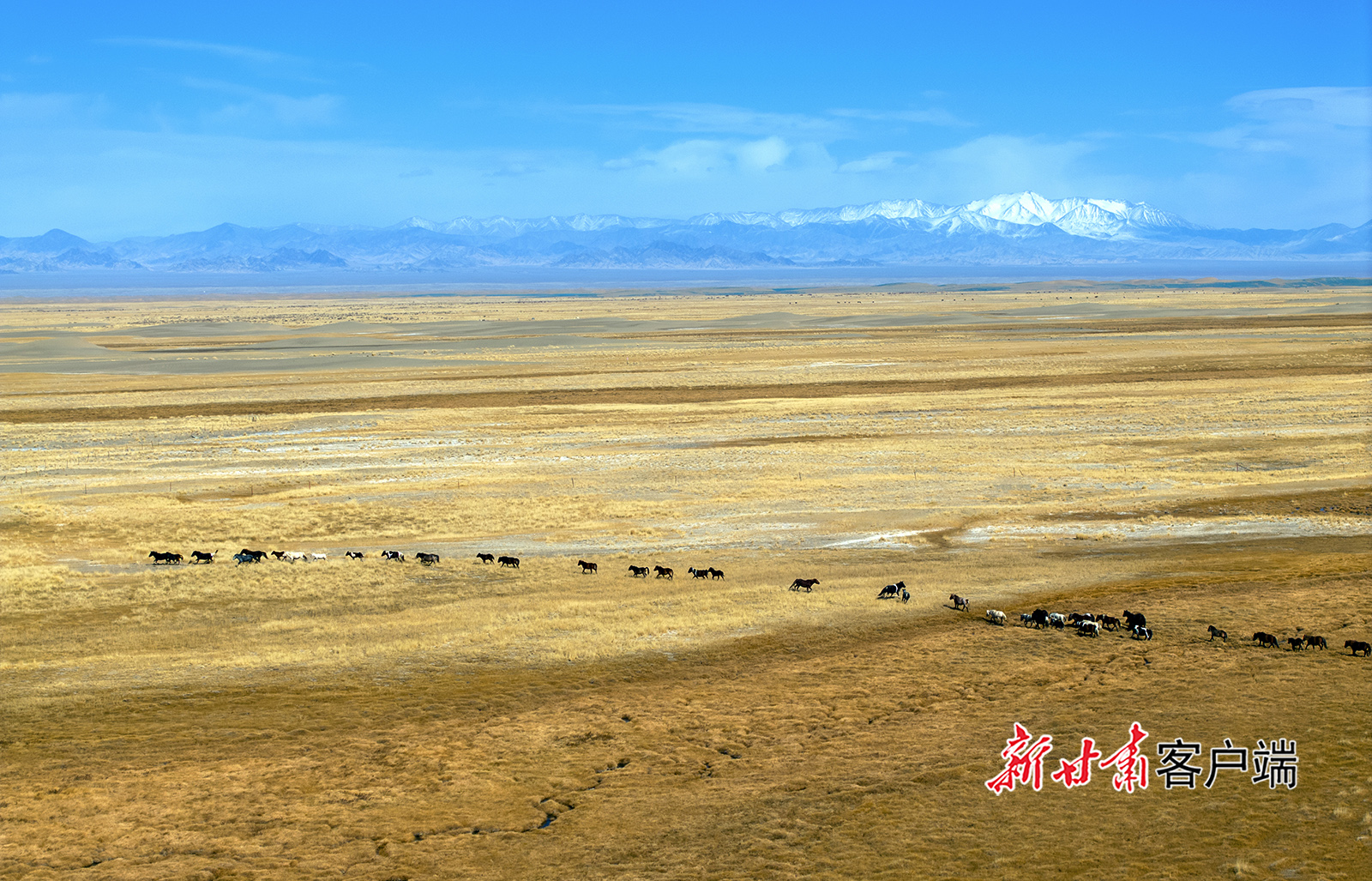 霜降时节,地处祁连山下的阿克塞县阿勒腾乡哈尔腾高原秋色宜人,骏马驰骋在金色的草原上,骆驼漫步在沙漠雪山间,呈现出别样的生态美景。