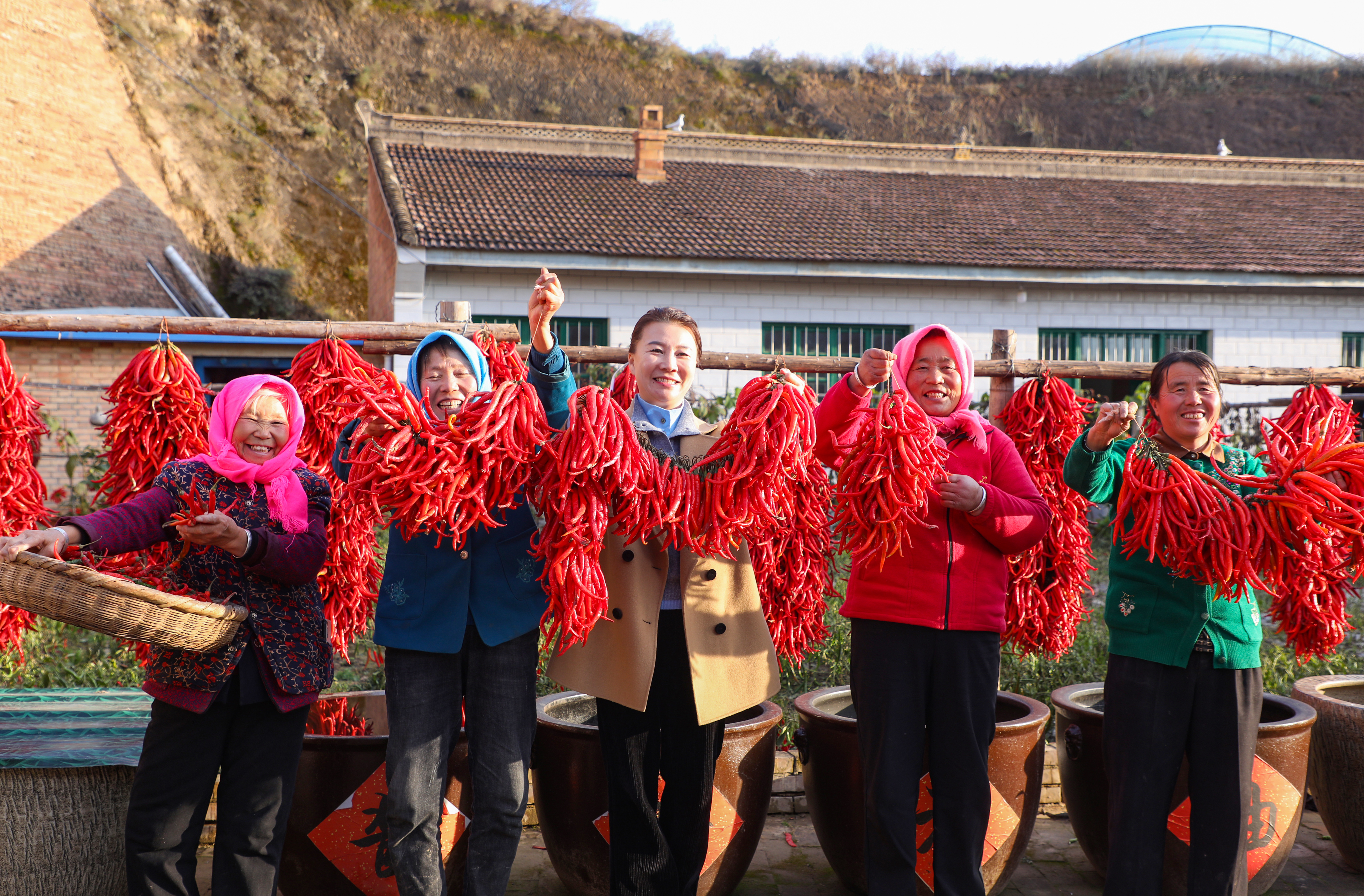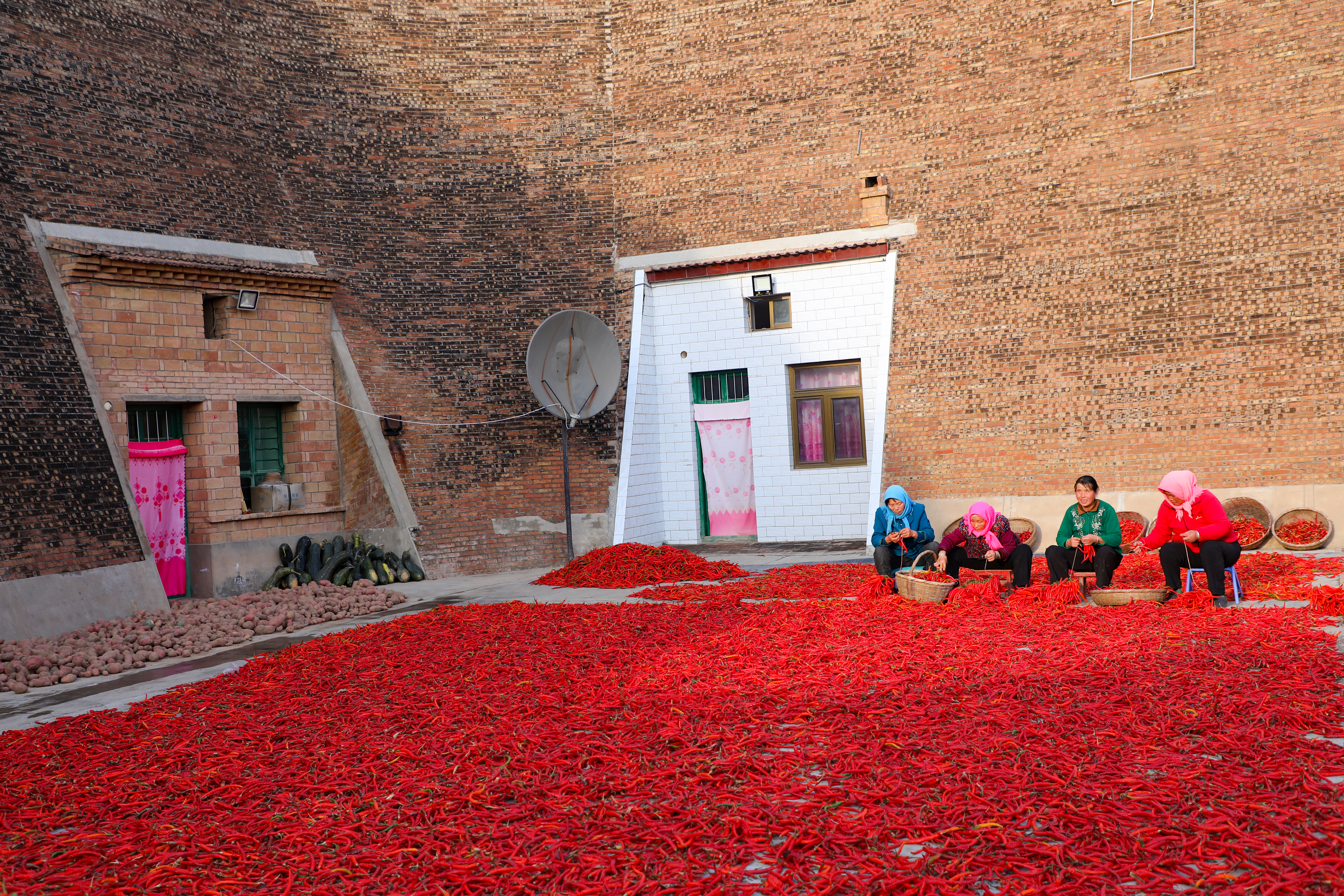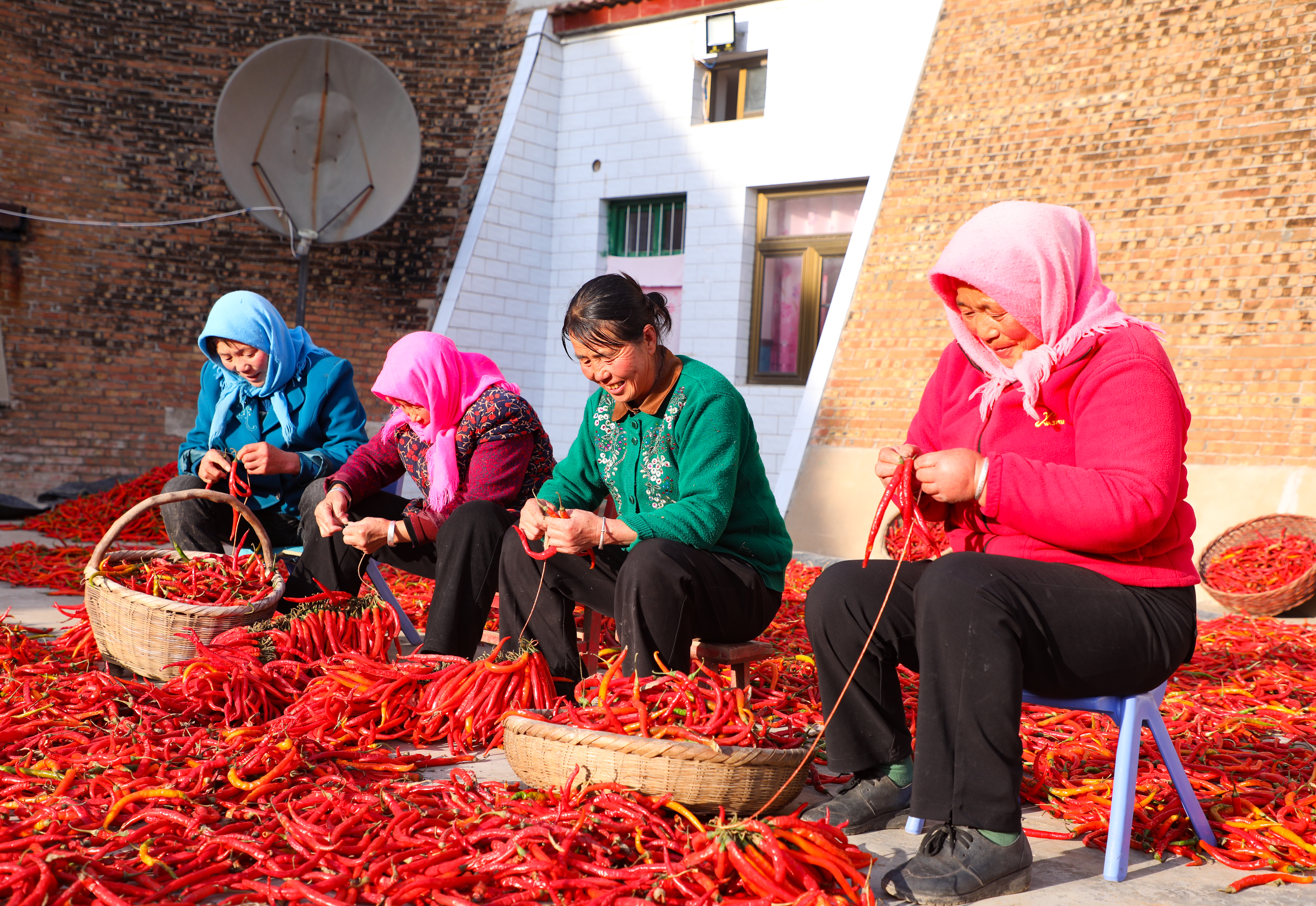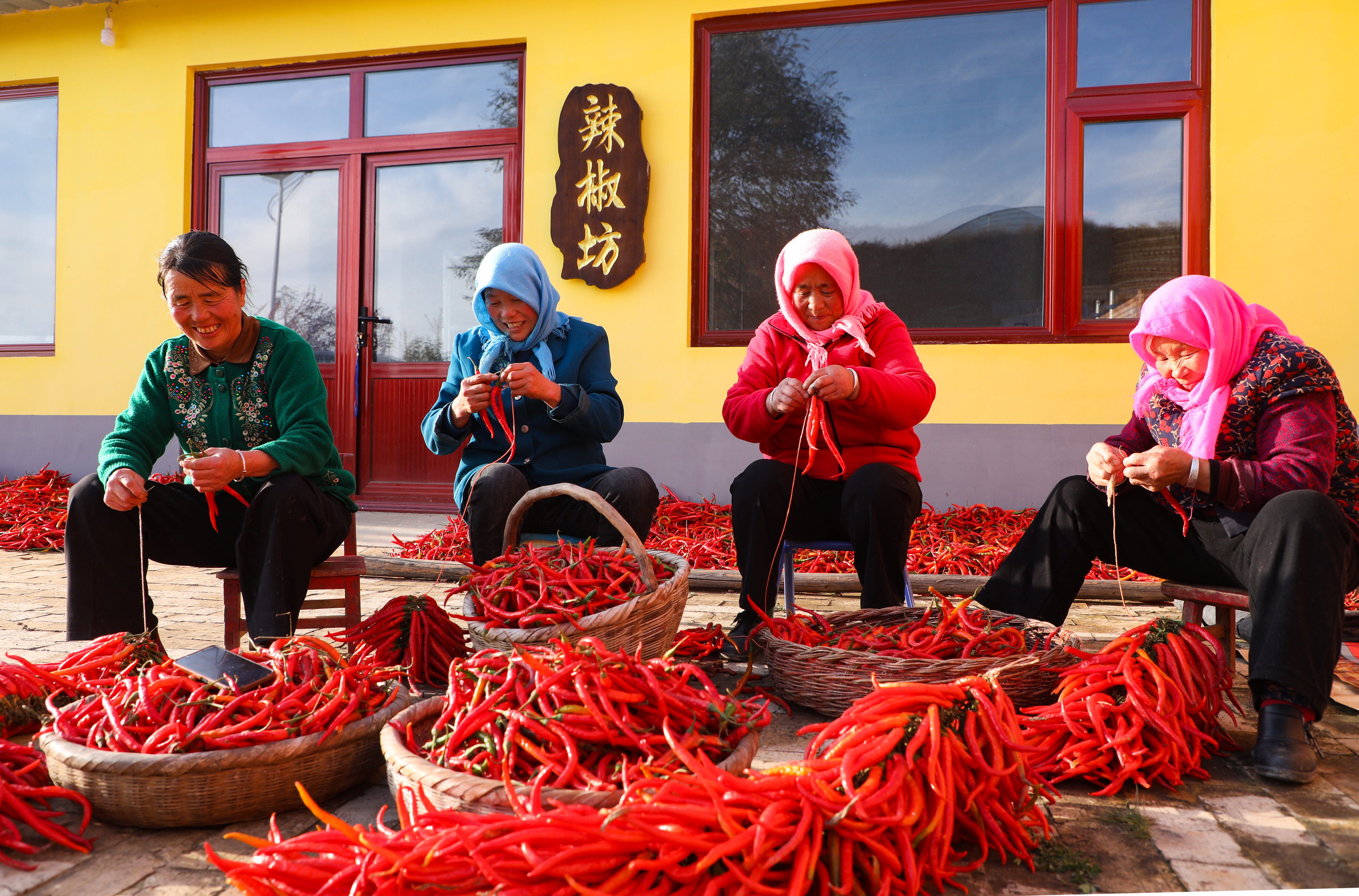 在这片红色的中心,是围坐在一起的“辣婶子”和乡邻们。她们手中针线穿梭,谈笑风生,灵巧地将地里的收成,将火红的日子,一针一线地串成长长的念想与希望。那专注的神情,爽朗的笑声,以及被阳光晒得发亮的脸庞,比任何色彩都更能打动人心。