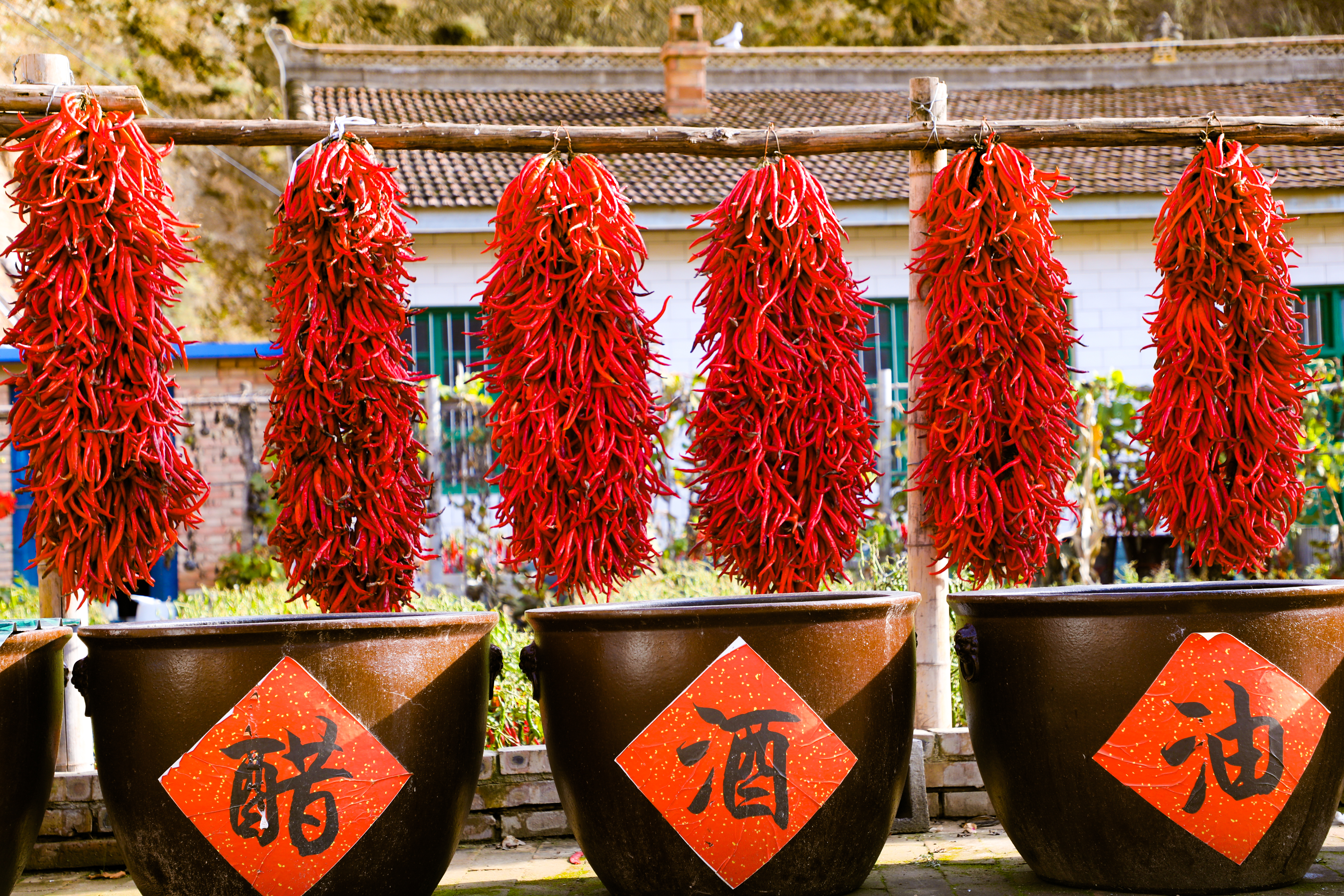 “九奶奶”李平家院子,火红的辣椒串挂满连廊,九奶奶坐在亭子中间忙碌着。“今年辣椒丰收了,长得好,红得快,最近都忙在辣椒上。晒的、腌的、磨的,都能卖钱。”李平乐呵呵地说道。