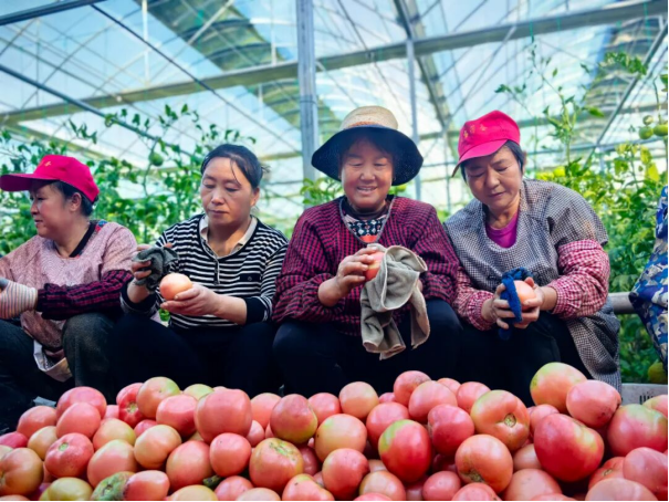 杨店镇豆家坪村的智慧农业温室大棚里,一串串饱满红润的“安纳西”西红柿挂满枝头,大棚里一片繁忙景象——村民们正忙着采摘、分拣、装箱,一颗颗鲜嫩的西红柿将通过商贩直达宝鸡、西安以及周边市场,成为餐桌上的“抢手货”。