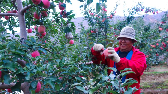 通渭县融媒体中心记者李晓春:“金秋十月,在榜罗镇毛家店村的苹果种植基地,3000亩果园迎来了丰收季,红彤彤的苹果挂满枝头,果香四溢,果农们也忙着采摘,接下来我们将跟随果农,感受这片黄土地上的丰收喜悦。”