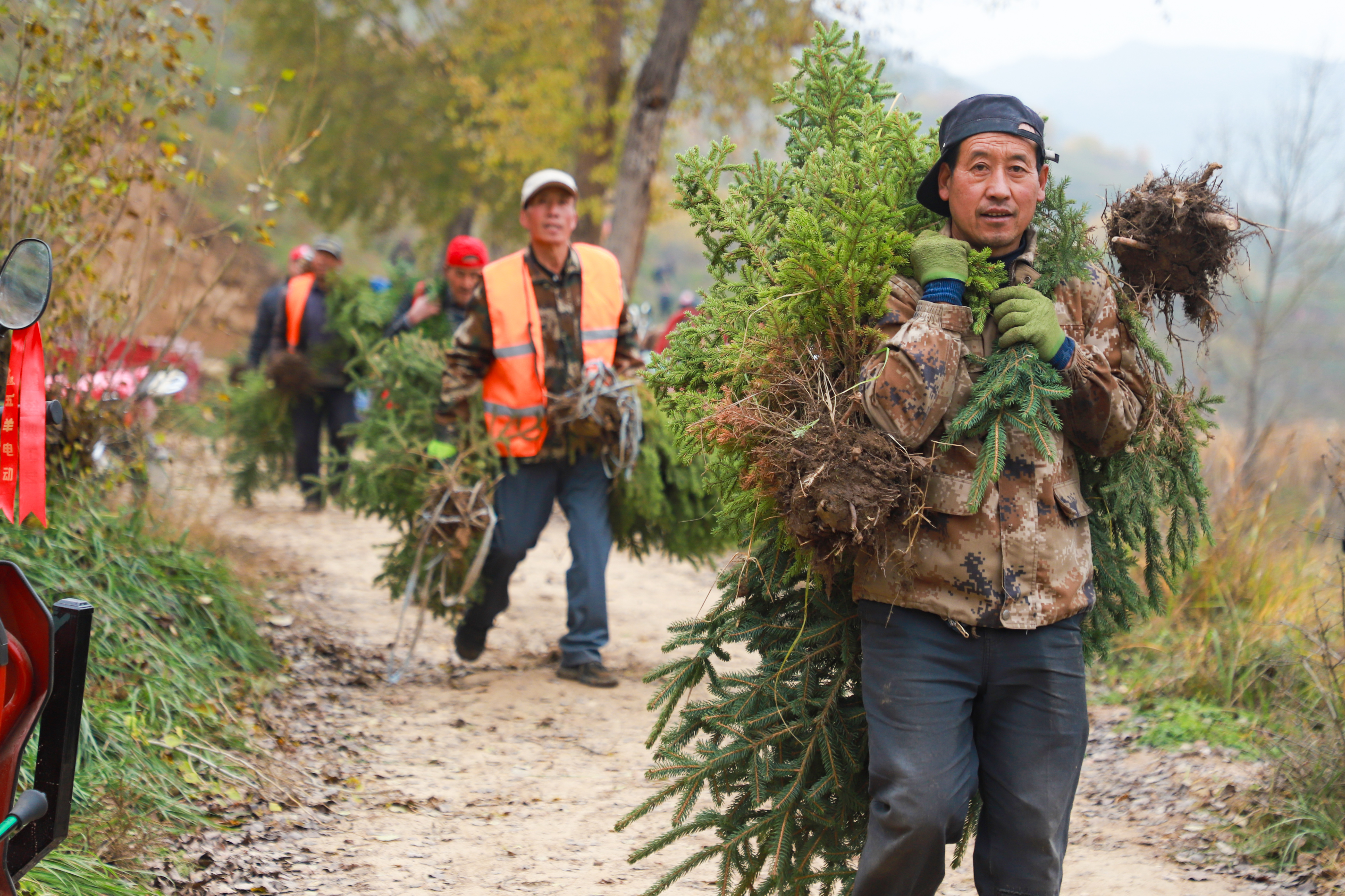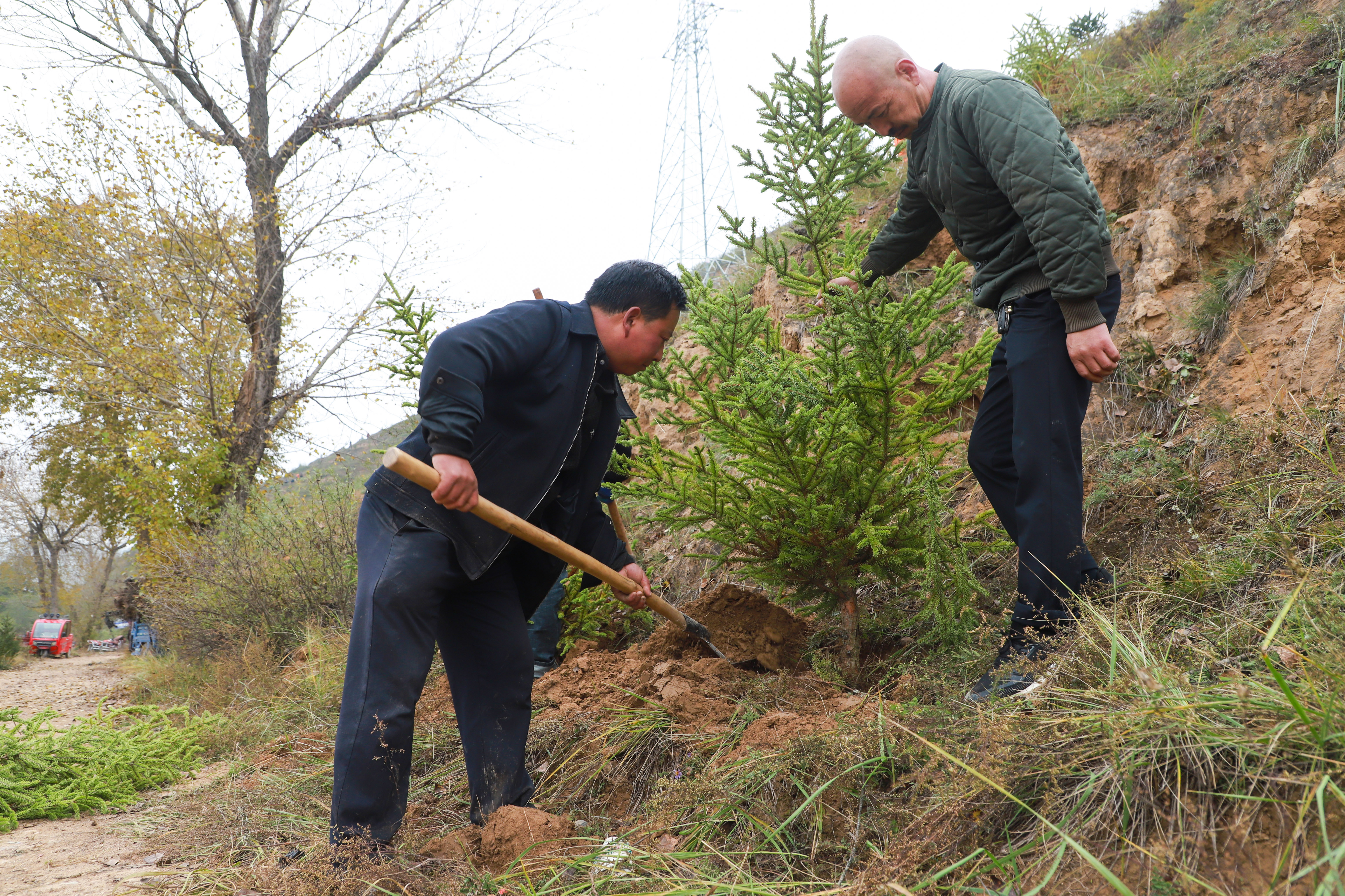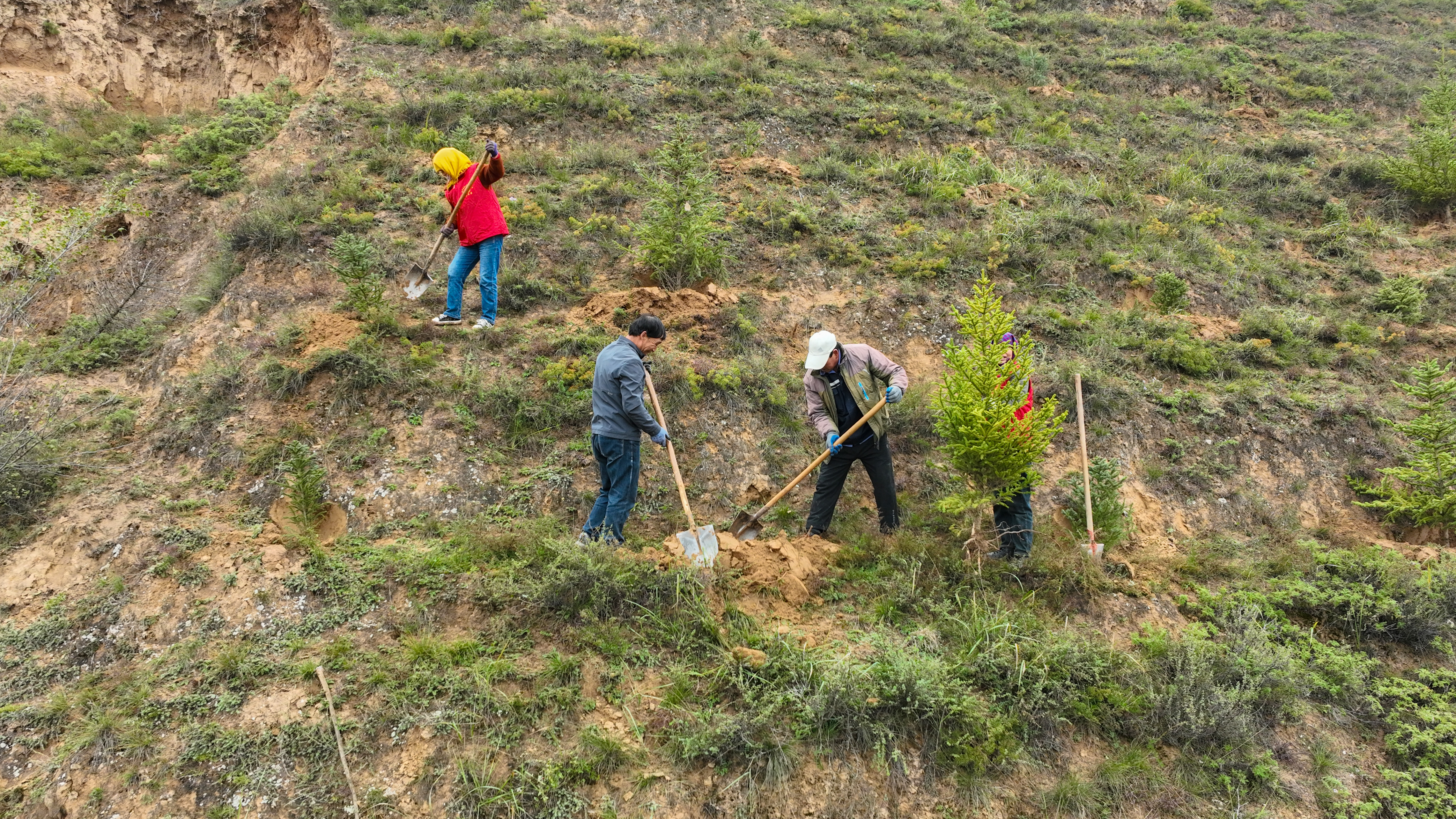植树现场,人头攒动。大家分工协作,挥锹铲土、扶苗填坑。放眼望去,一株株新栽的云杉、侧柏树苗整齐排列,在秋风中昂然挺立,为黄土高原增添了勃勃生机。