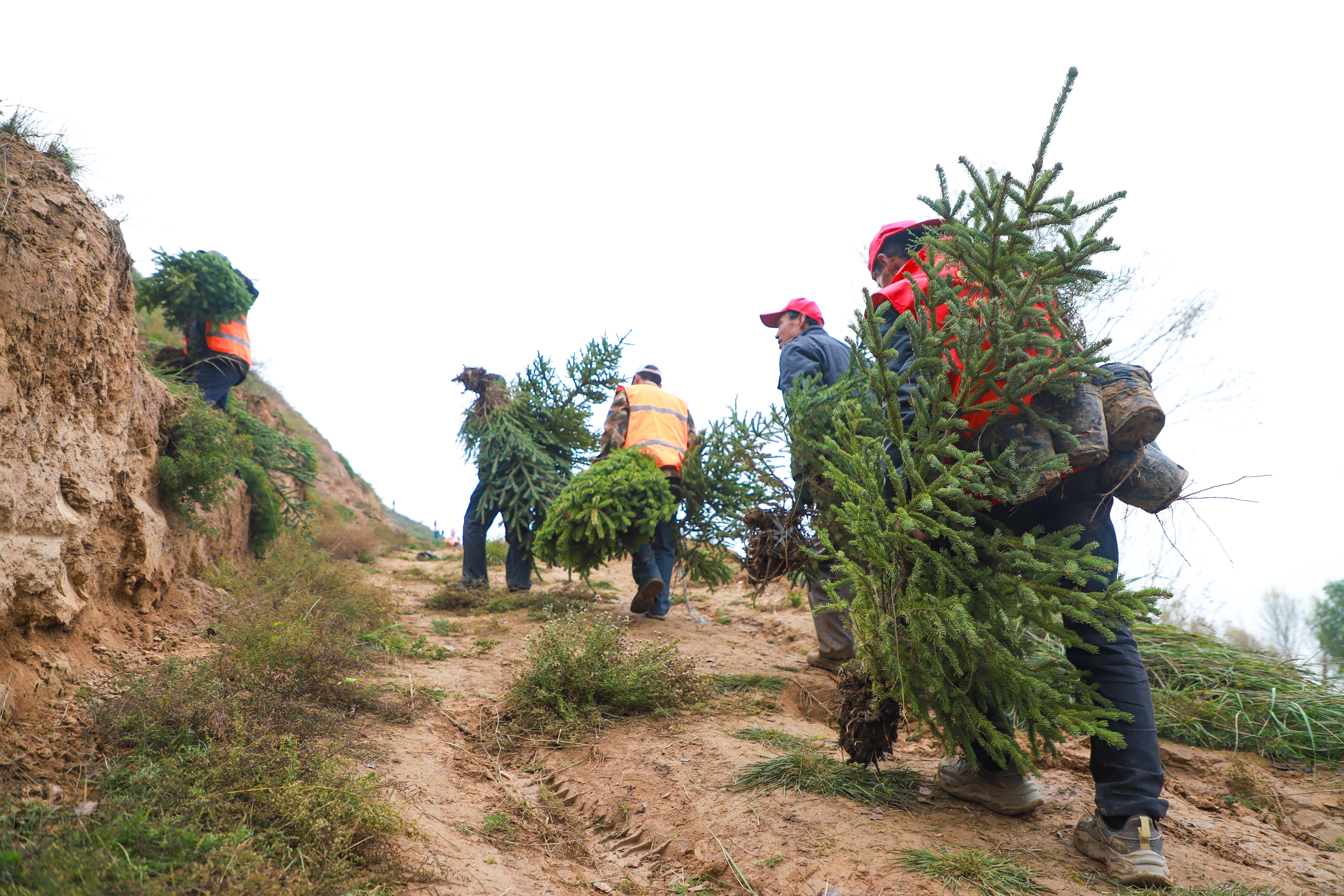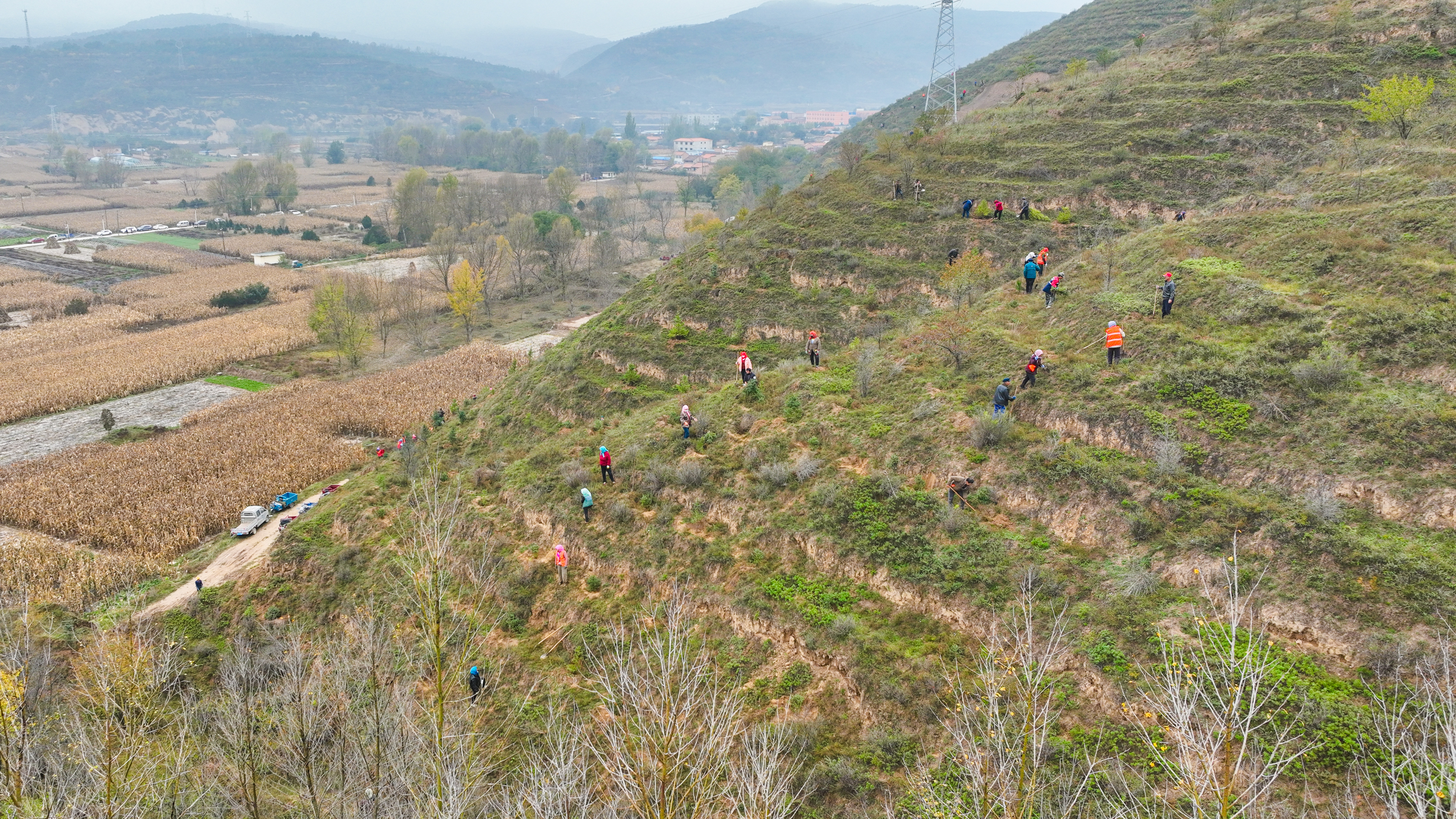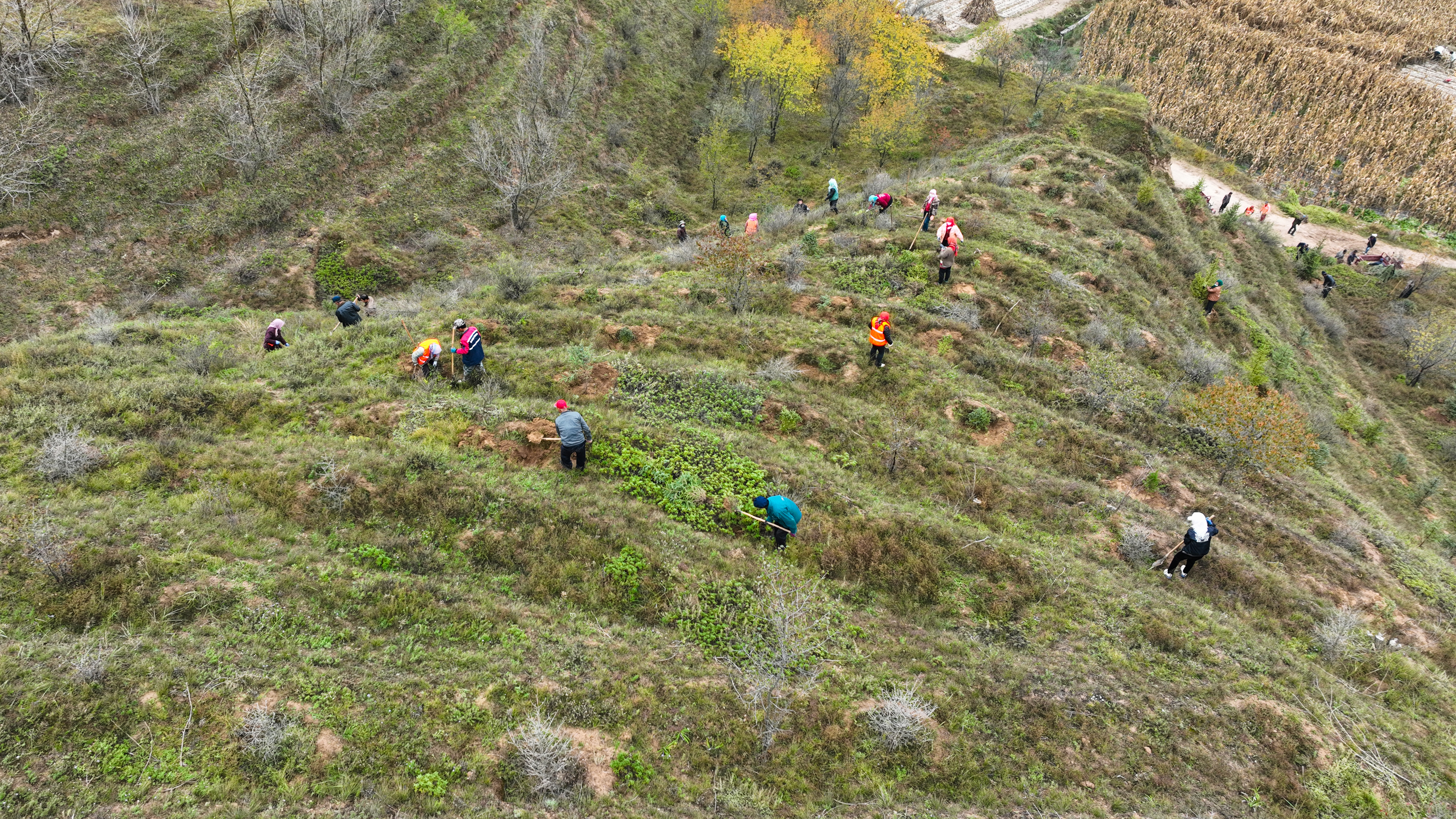 植树现场,人头攒动。大家分工协作,挥锹铲土、扶苗填坑。放眼望去,一株株新栽的云杉、侧柏树苗整齐排列,在秋风中昂然挺立,为黄土高原增添了勃勃生机。