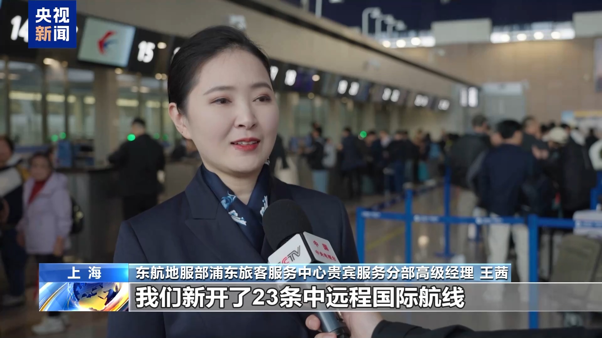 东航地服部浦东旅客服务中心贵宾服务分部高级经理 王茜:我们新航季平均每周计划执行的国际及地区航班同比2024年冬春航季增加了超11%。去年以来,我们新开了23条中远程国际航线,12月4日即将开通的上海浦东到奥克兰到布宜诺斯艾利斯航线也将成为全球最长航线,我们也将实现在全球各大洲的航线全覆盖。