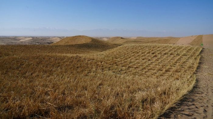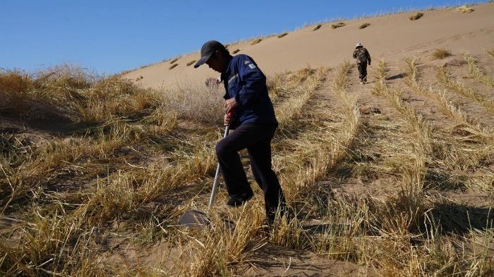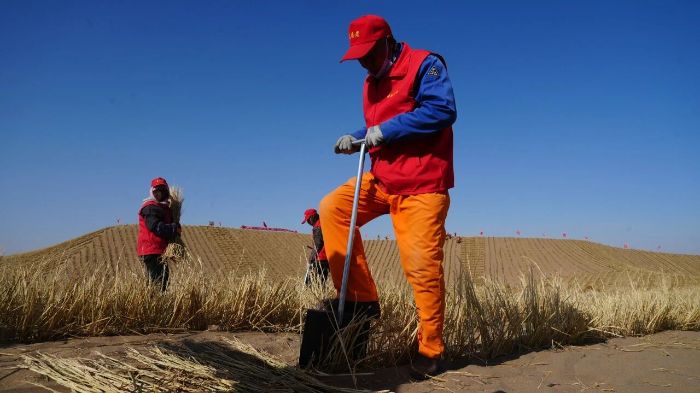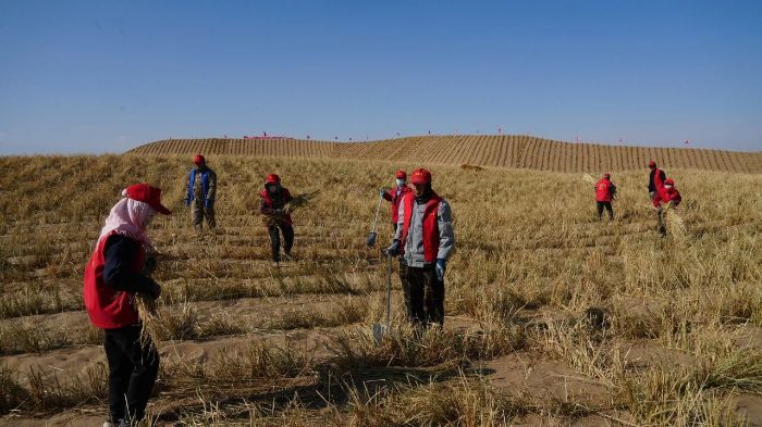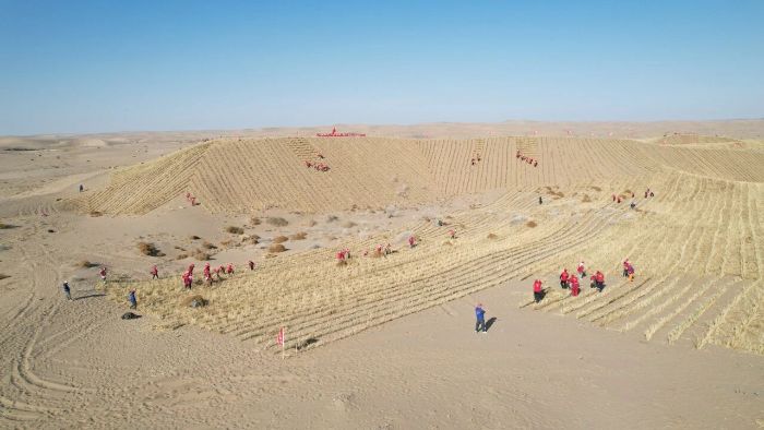 近日,记者在肃南县明花乡3.27万亩工程固沙项目建设现场看到,工人们正顶着风沙,紧张有序地进行草方格压沙作业。他们先将麦草、稻草等材料横竖交织地铺在沙地上,再用铁锹将其中部压入沙中,形成一个个一米见方的草方格。这种被誉为“中国魔方”的草方格沙障,能有效增加地表粗糙度,削弱风力,阻挡沙粒流动,为后续种植沙生植物、恢复自然植被创造宝贵的生存条件。