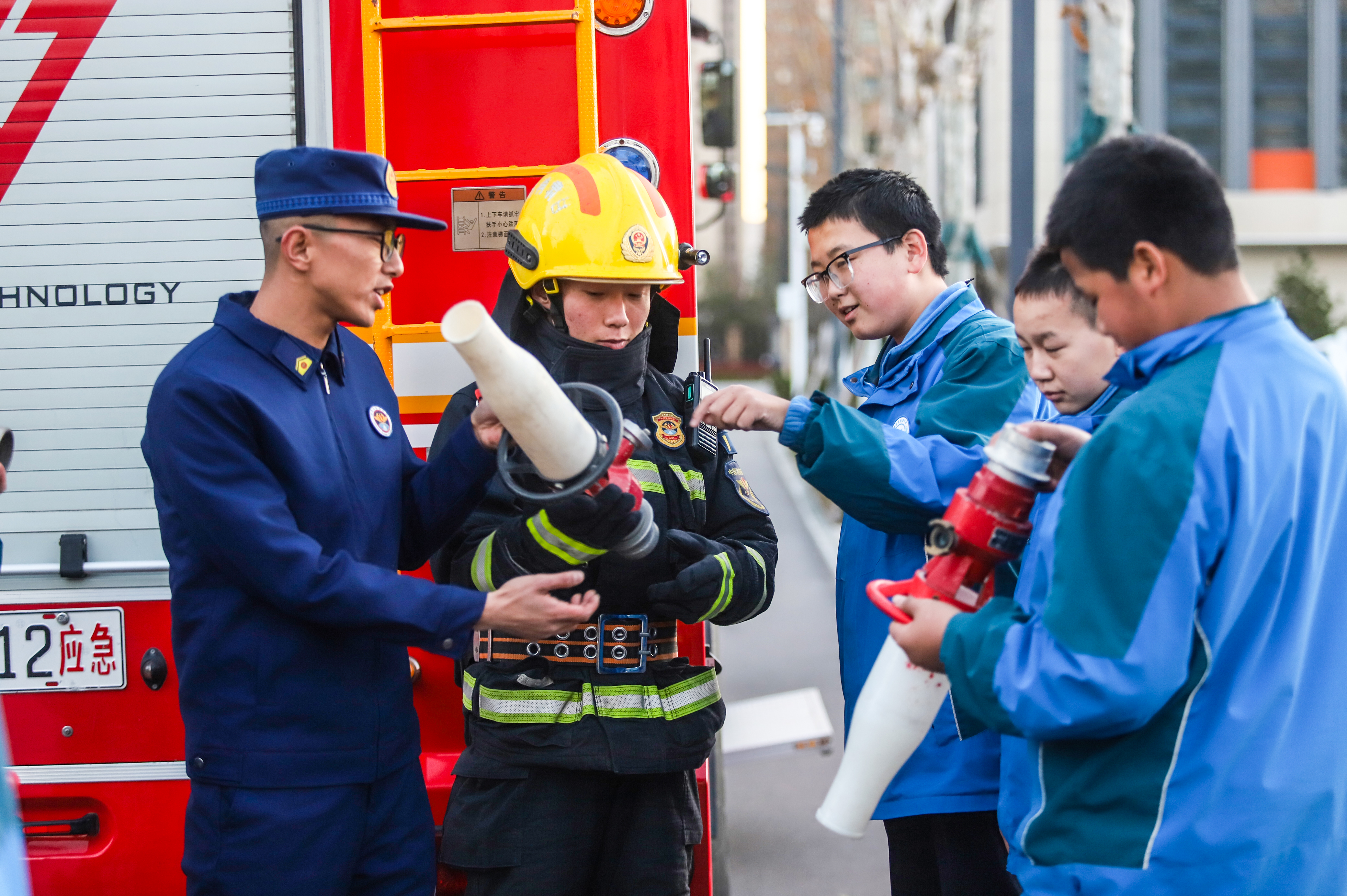 演练结束后,消防宣传员现场演示灭火器“提、拔、握、压”四步操作法和消火栓“一铺二接三射”使用流程,并邀请师生代表进行实操演练。针对操作中的常见误区,宣传员逐一进行“一对一”纠正指导,确保每位参与者都能正确掌握器材使用技能。师生们还近距离参观了消防救援装备,通过直观了解破拆工具、生命探测仪等设备的性能用途,进一步深化对消防救援工作的认知。