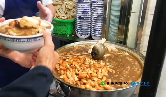 走进清晨7点钟的高财流泉面筋店,香气四溢的“烟火气”中,一碗碗热气腾腾的面筋粉皮汤,为进店的每一位顾客驱赶冬日的严寒,开启一场味蕾上的沉浸体验。“怀胎那个三月里啊,三月里三清明。想吃个黄芽儿葱啊,还得那喷面筋……”这不仅是一首流传久远的甘州民歌,更是这味非遗美食传承的生动注脚。