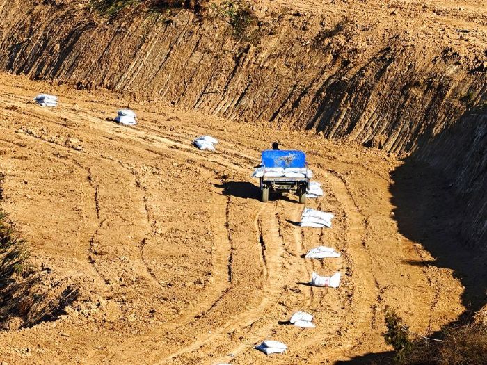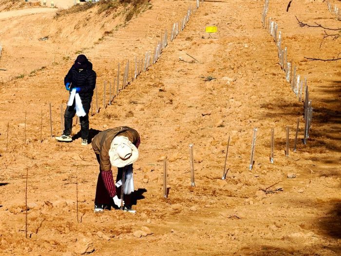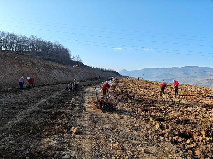 在花牛镇九峪村果园改造现场,挖掘机轰鸣作响,翻整土地;村民们分工协作,安装地网、栽植新苗、套上保温袋、施撒肥料。与此同时,现代化滴灌设施铺设工作同步推进,寒冷天气中呈现出一幅“冬忙”的火热图景。