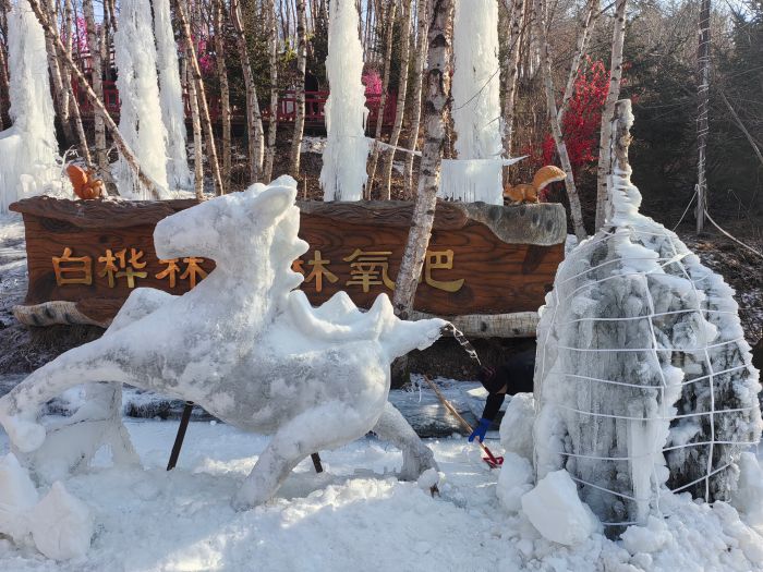 连日来,康乐县八松乡烈洼村的白桦林景区已悄然换上银装,造雪机隆隆作响,细碎雪粒如琼花般洒向枝头林间,工匠们正精心雕琢着冰马、冰象等各式冰雕作品,一场为期三个月的“冰雪狂欢”已进入冲刺阶段,即将于12月中旬与游客见面。