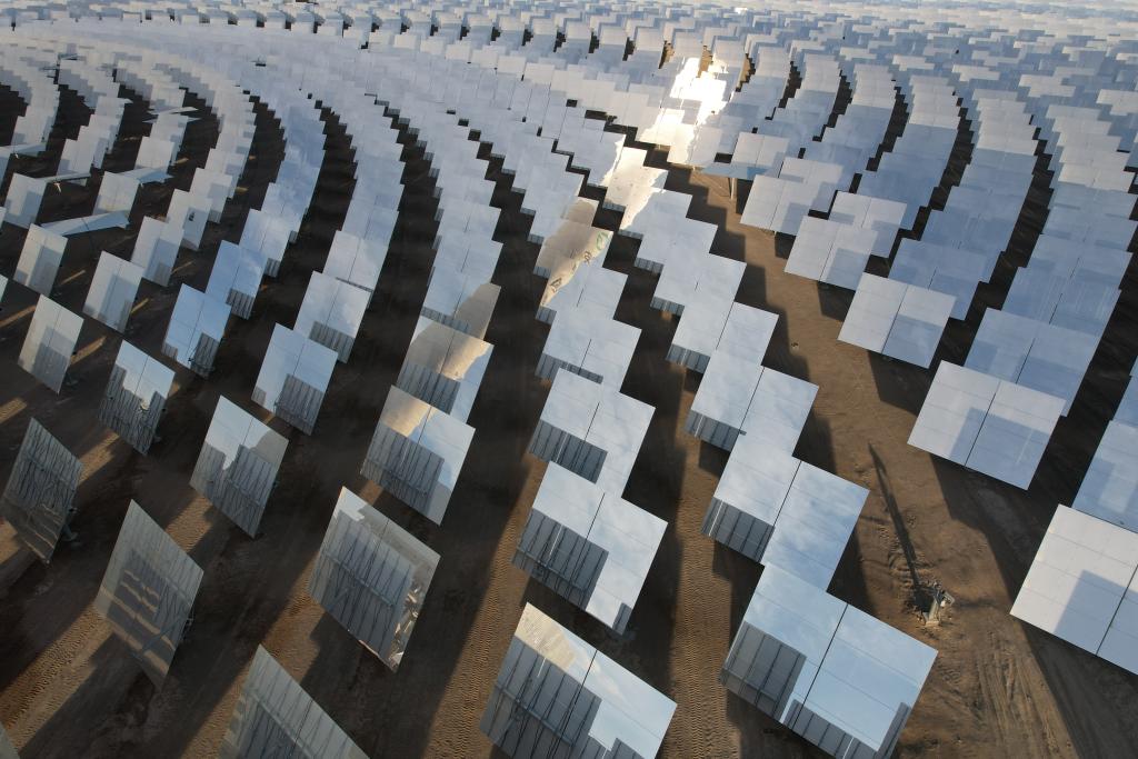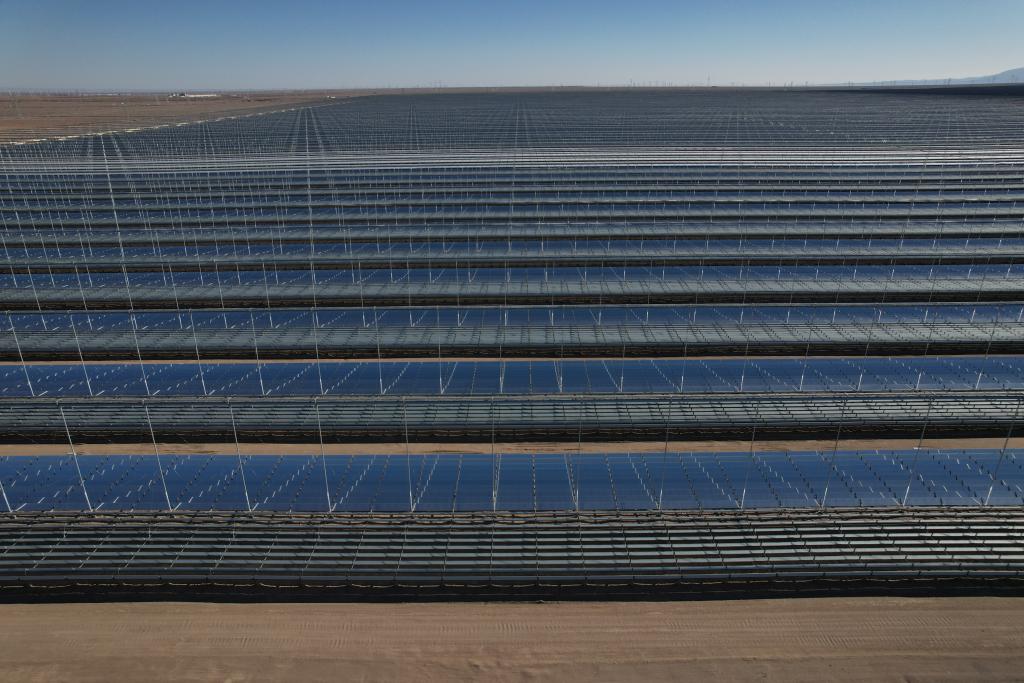 这是12月2日在甘肃省玉门市拍摄的10万千瓦熔盐线性菲涅尔式光热电站(无人机照片)。新华社记者 范培珅 摄