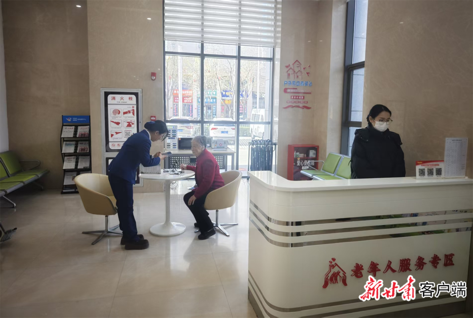 在平凉市区政务服务中心“老年人服务专区”,“萍萍帮办”团队成员正在为老人查询业务办理情况。