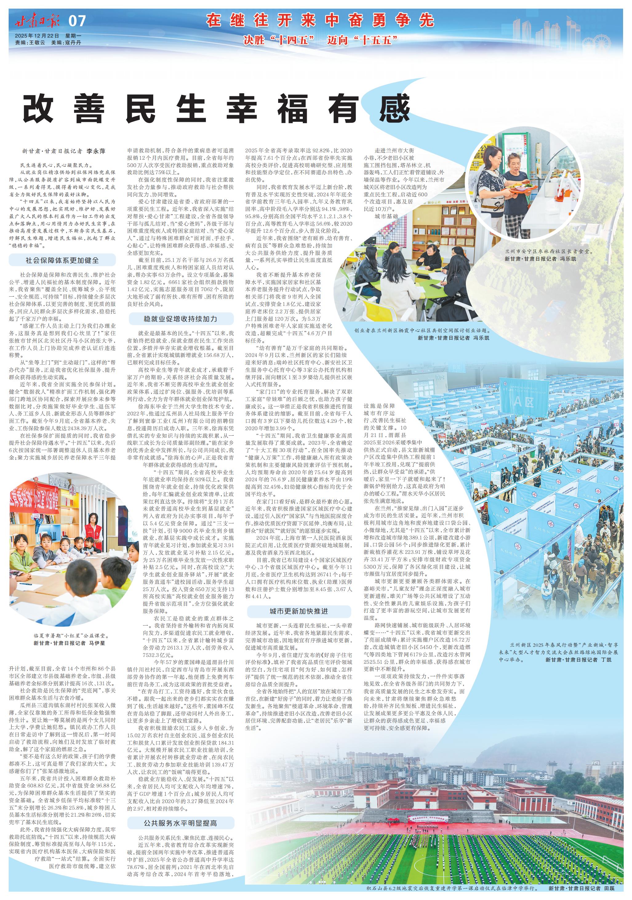 一项项政策持续发力,一件件实事落地见效,在全省各级各部门的共同努力下,我省高质量发展的民生之本愈发夯实。面向未来,甘肃将继续聚焦群众急难愁盼,持续补齐民生短板、增进民生福祉,让发展成果更多更公平惠及全体人民,让群众的获得感成色更足、幸福感更可持续、安全感更有保障。