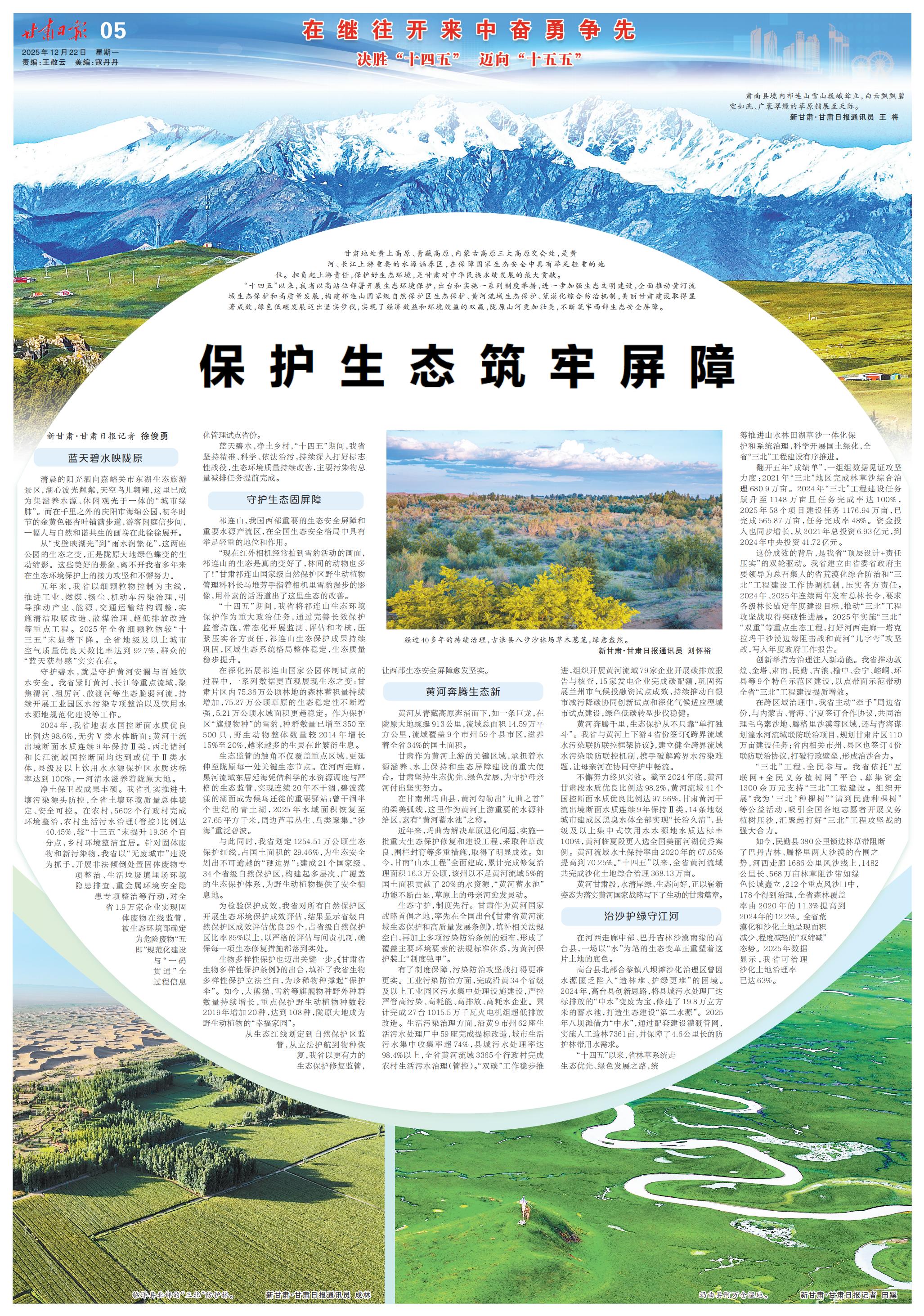 2024年,我省地表水国控断面水质优良比例达98.6%,无劣Ⅴ类水体断面;黄河干流出境断面水质连续9年保持Ⅱ类,西北诸河和长江流域国控断面均达到或优于Ⅱ类水体,县级及以上饮用水水源保护区水质达标率达到100%,一河清水滋养着陇原大地。