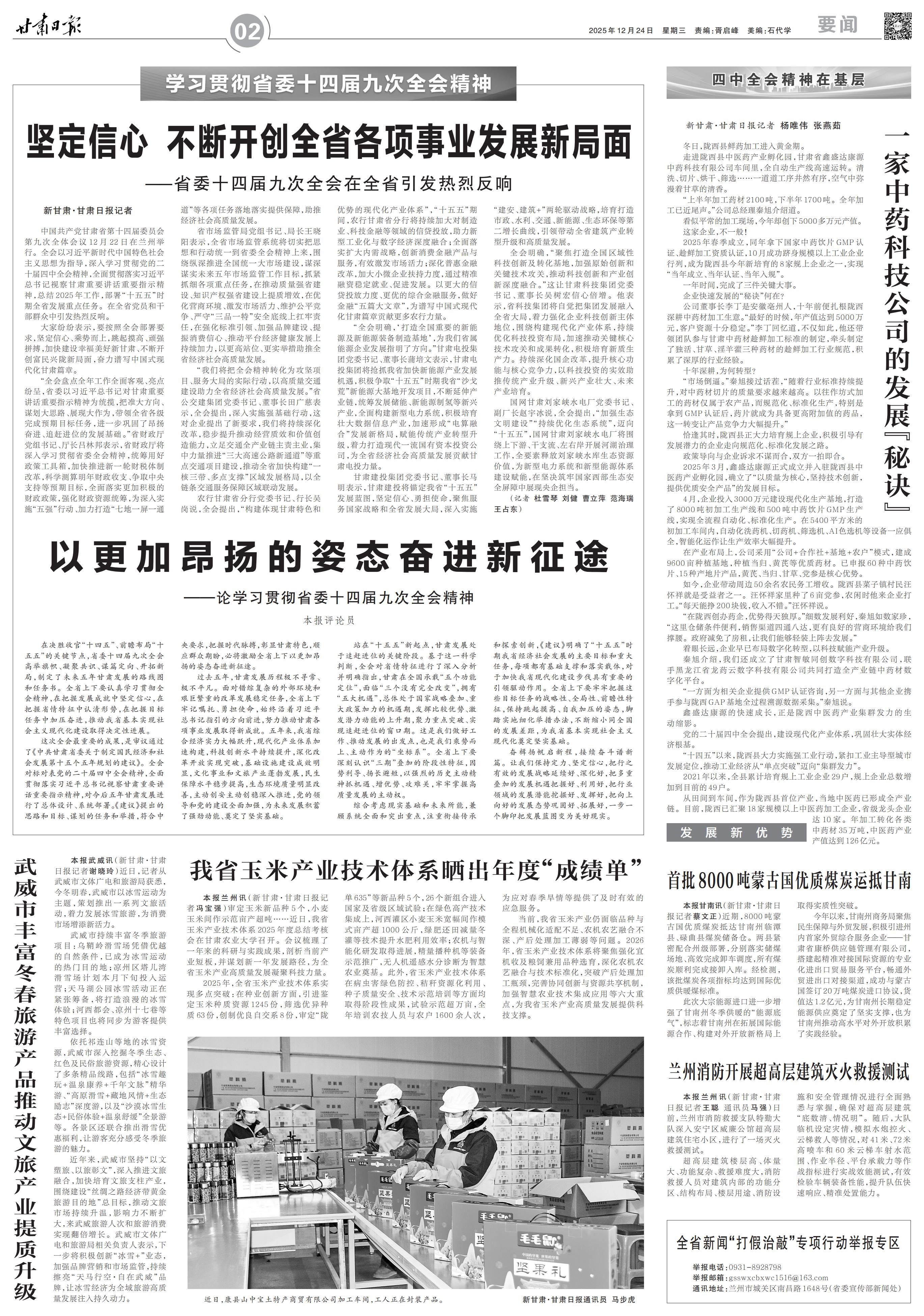 中国共产党甘肃省第十四届委员会第九次全体会议12月22日在兰州举行。全会以习近平新时代中国特色社会主义思想为指导,深入学习贯彻党的二十届四中全会精神,全面贯彻落实习近平总书记视察甘肃重要讲话重要指示精神,总结2025年工作,部署“十五五”时期全省发展重点任务。在全省党员和干部群众中引发热烈反响。