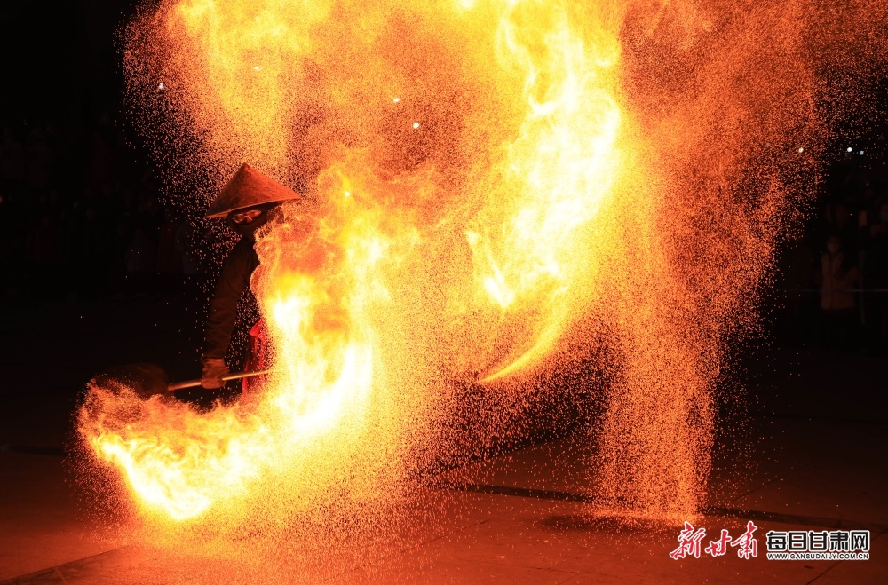 春节期间,临夏永靖“打铁花”,黄河岸边上演了古老的“烟花秀”。新甘肃·每日甘肃网通讯员 瞿海东
