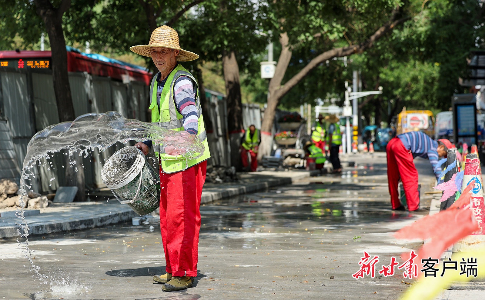 市政工程施工人员为作业路面洒水降温。新甘肃·甘肃日报记者 冯乐凯