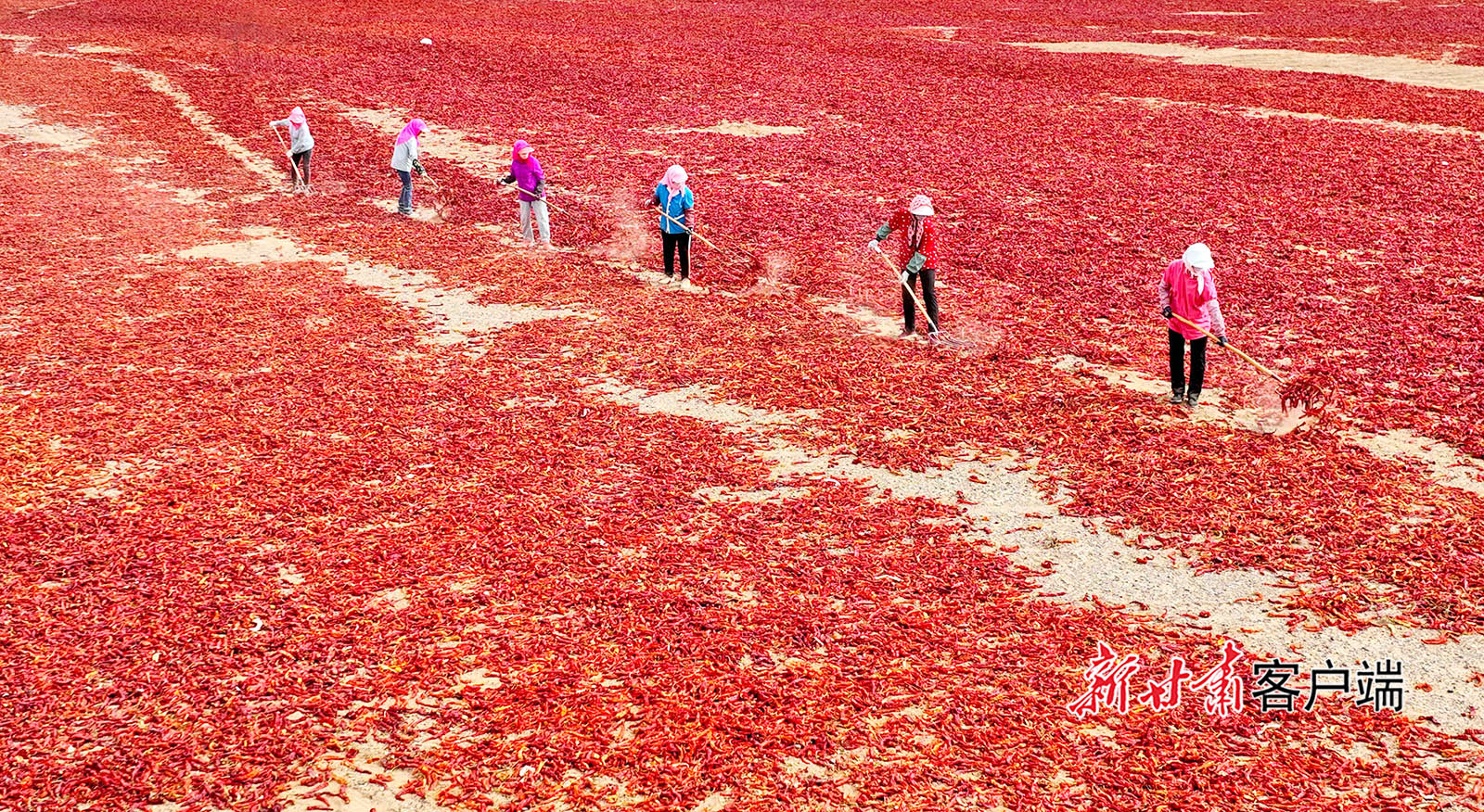 高台县黑泉镇十坝珍珠滩,种植户正在晾晒红辣椒,呈现出一幅壮美的戈壁晒秋“丰”景。新甘肃·甘肃日报通讯员 王 将 张臣道