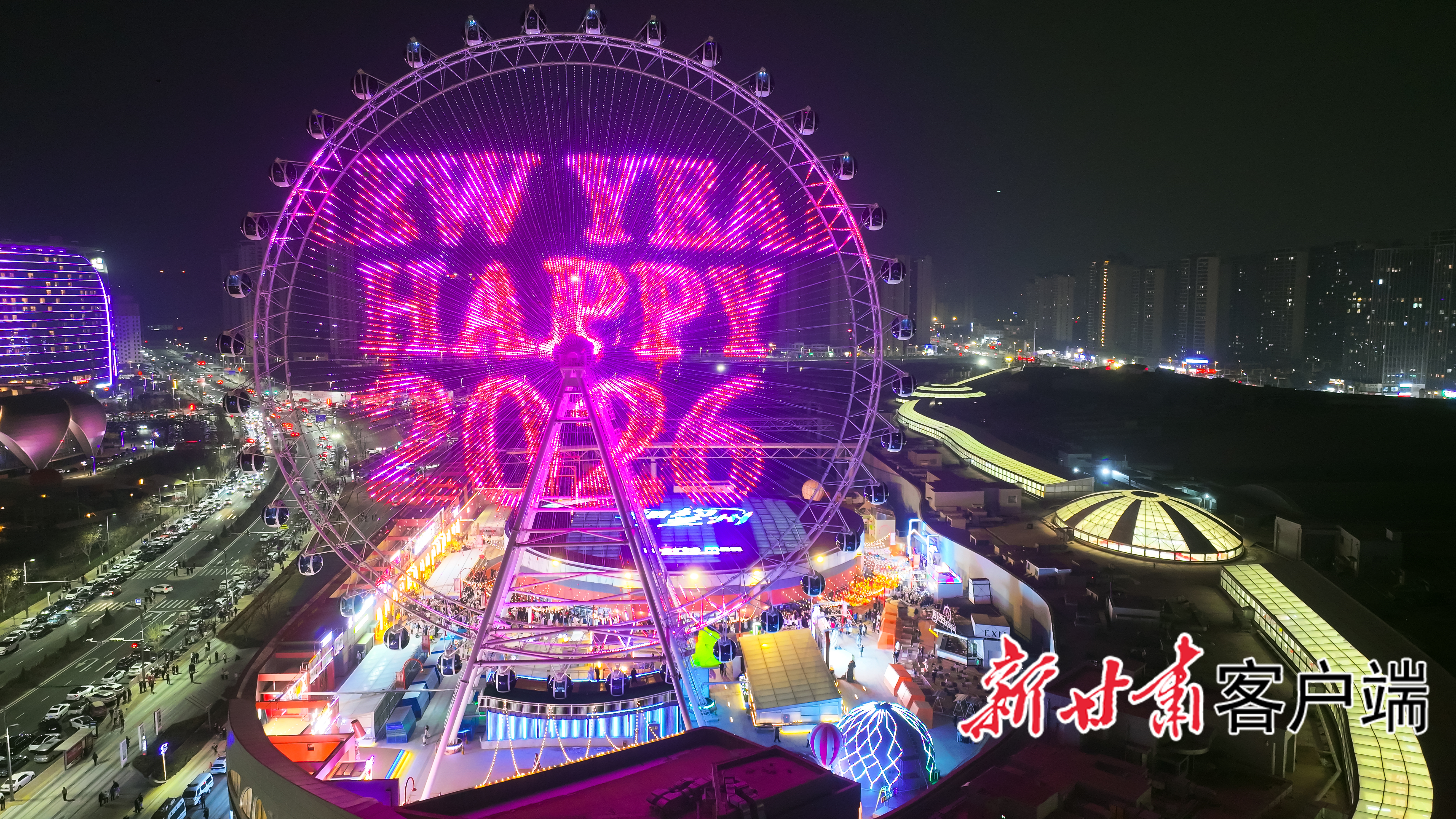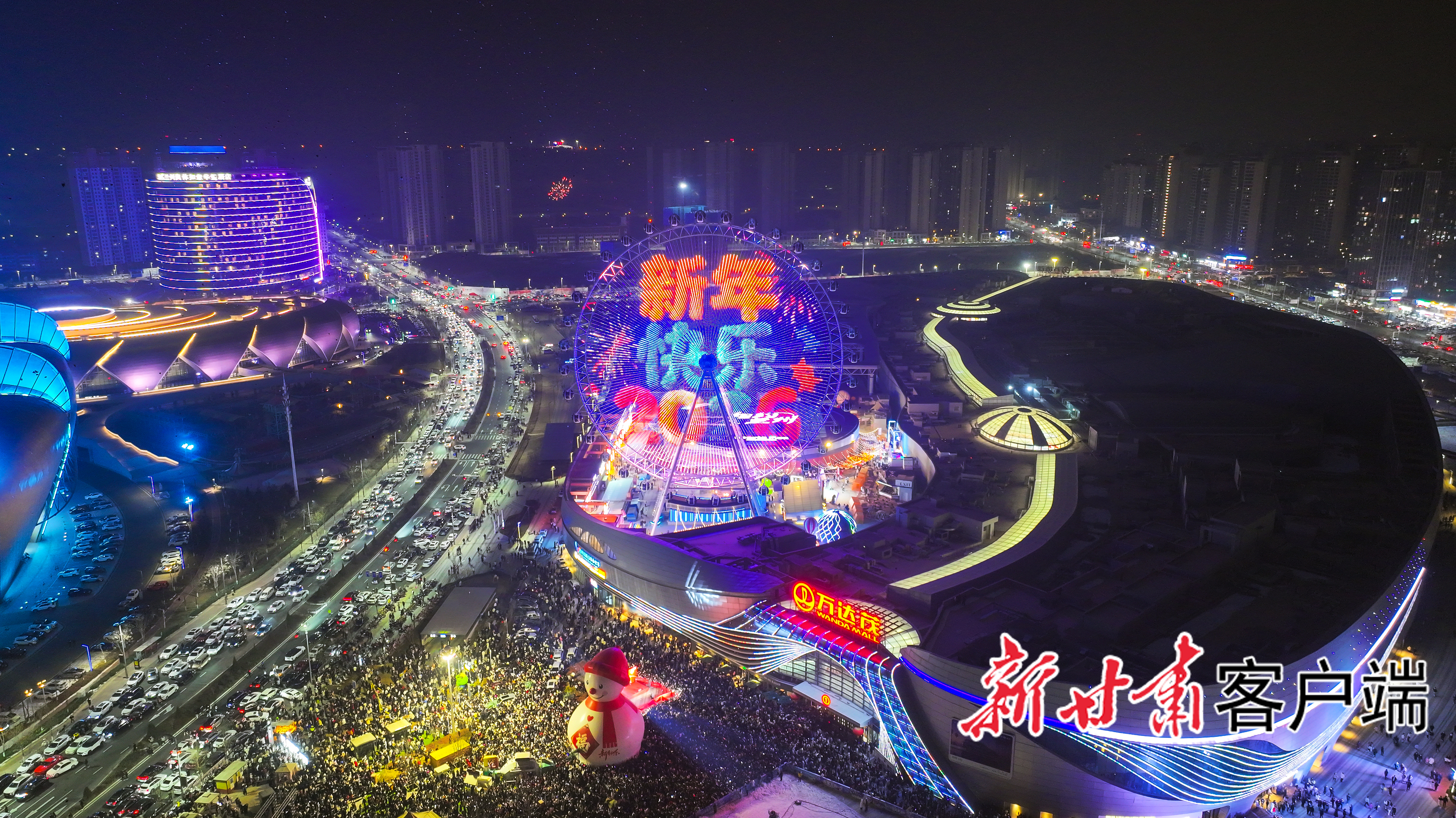 兰州地标摩天轮光影随乐变幻,与无人机秀共呈视觉盛宴,此为兰州万达茂跨年压轴活动,丰富市民节日生活、激活夜经济。新甘肃·甘肃日报记者 马伊星