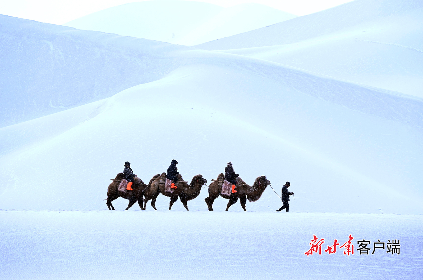 2025年12月30日,敦煌市普降瑞雪迎接新年的到来,游客在鸣沙山月牙泉景区踏雪赏景。 新甘肃·甘肃日报通讯员 张晓亮