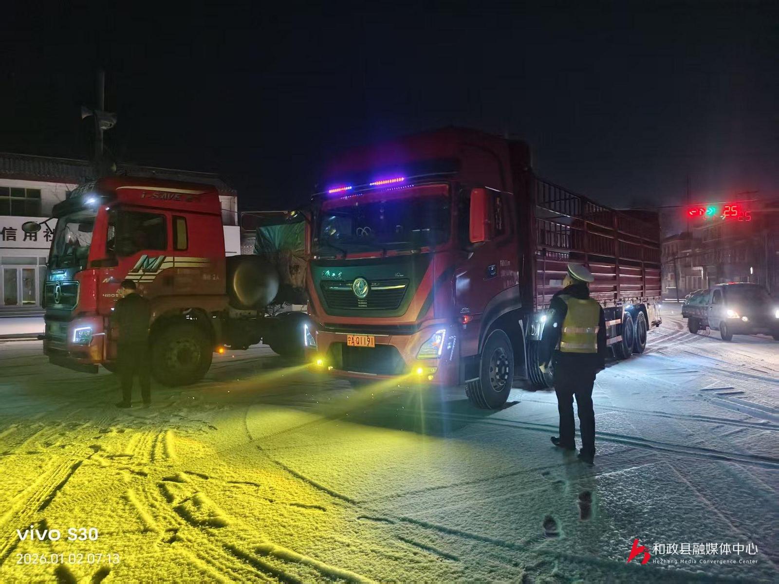 险情就是命令,雪情就是号角。第一时间,和政县公安局交管大队以雪为令、闻雪而动,迅速启动恶劣天气道路交通应急管控预案,全体民辅警放弃休息、整装出发,火速奔赴辖区各重点路段、关键节点开展交通保障工作。在积雪最厚重、通行最困难的国道310南阳山长下坡路段,民辅警顶风冒雪坚守执勤一线,踩着没过脚踝的积雪,踏冰巡查,细致排查路面结冰、边坡易滑等安全隐患,对过往车辆进行耐心引导、有序疏导,提醒驾驶员减速慢行、谨慎驾驶,全力防范交通事故的发生。寒风吹红了脸颊,冰雪打湿了警服,但他们手中的指挥手势始终标准规范,闪烁的警灯在皑皑白雪中格外醒目,为雪夜中奔波的广大司机点亮了平安归程,那一抹亮眼的荧光绿,成为寒冬里最温暖、最坚实的依靠。