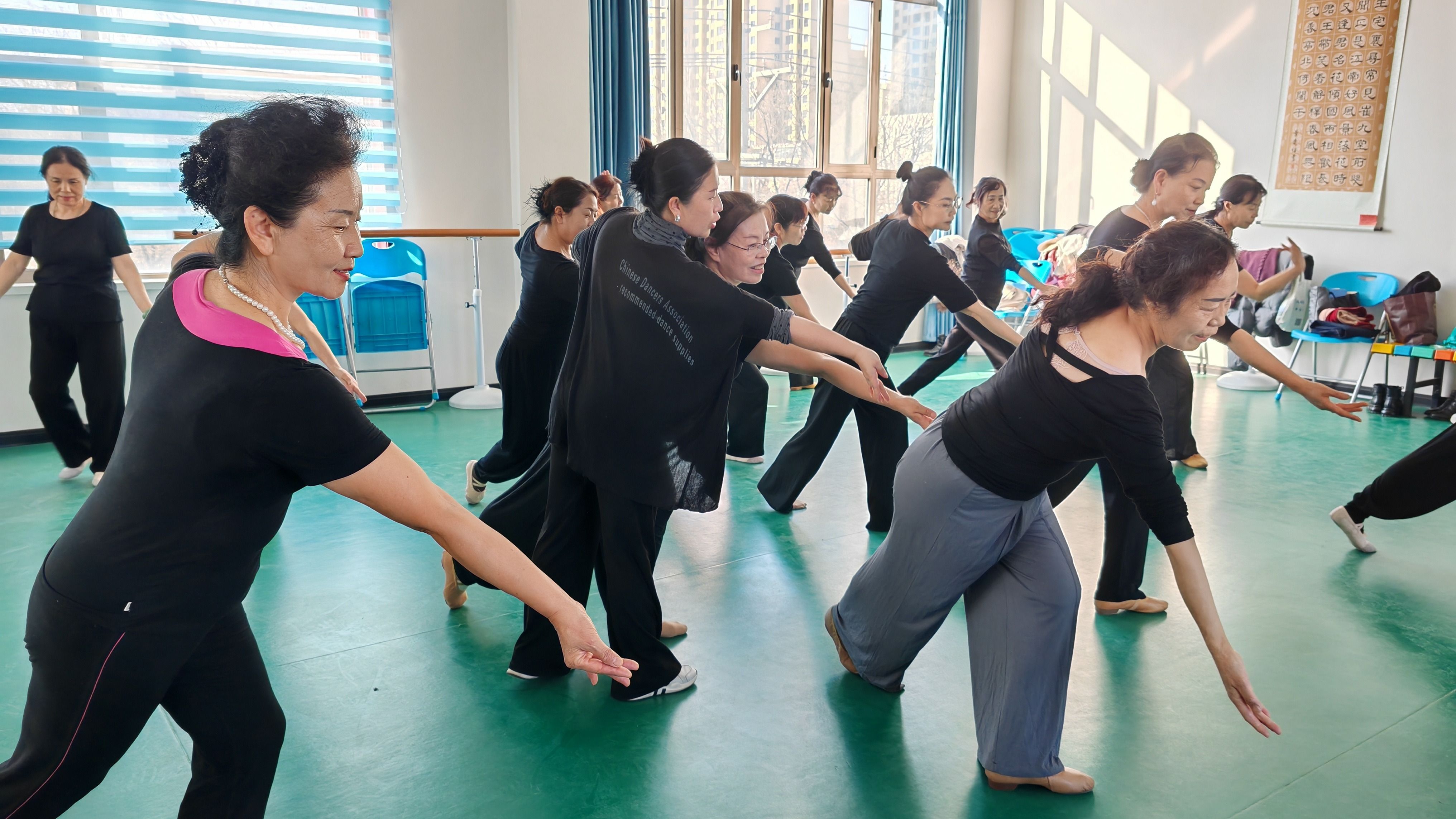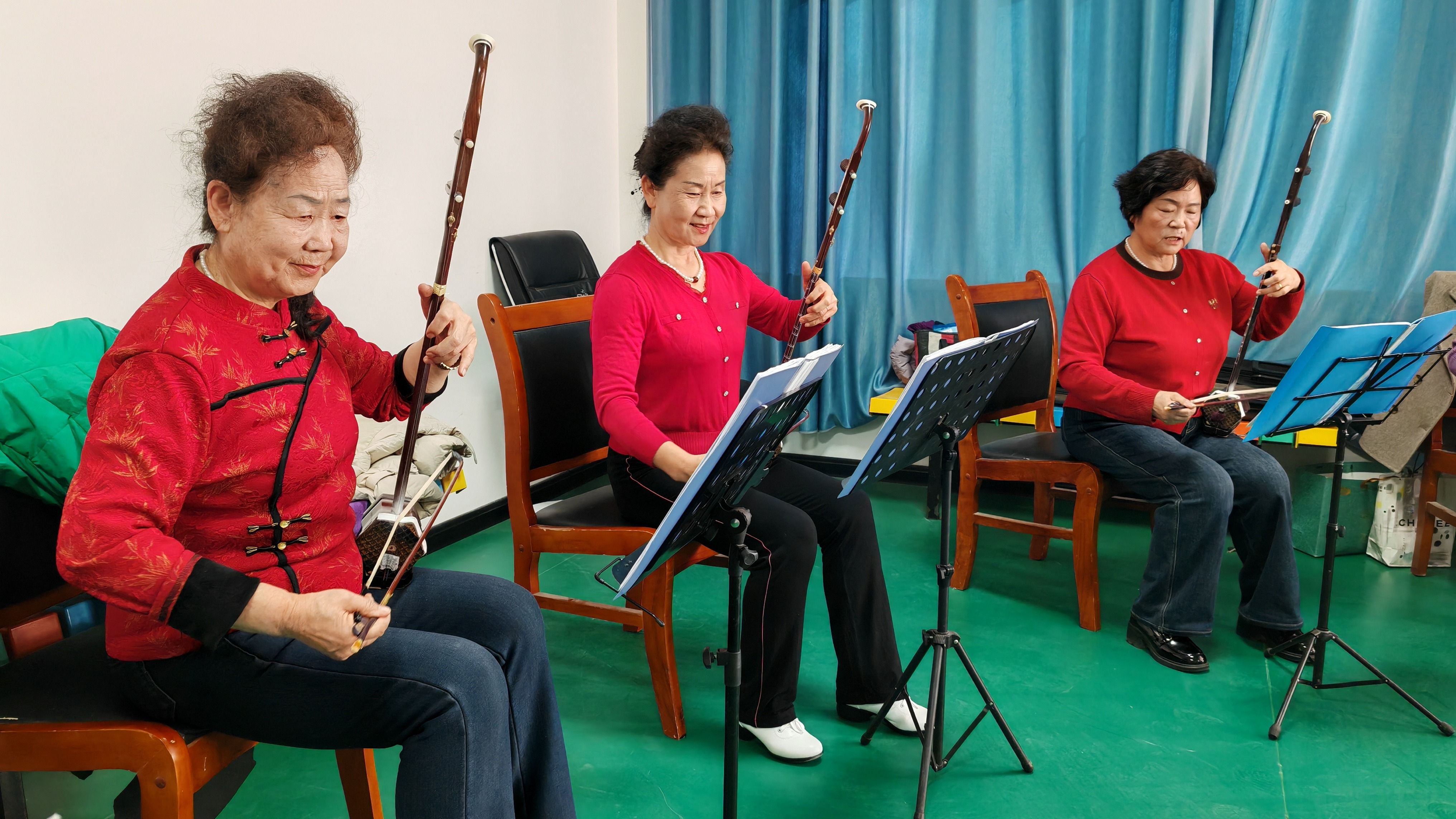 隔壁的舞蹈教室内,60岁的闫菊玲正在进行舞蹈排练,她动作舒展,散发着自信的光彩。2015年从电信公司客户管理岗位退休后,她在这里找到了新的家园,声乐、舞蹈、二胡,一周八节课,日程表安排的满满当当。“很多人都觉得退休就是带孙子、买菜做饭,但是我现在喜欢打扮、注意形象,身边的人都觉得我很快乐,感觉生活特别充实、特别有意义。”她身着蓝色长裙,说话间尽显优雅。