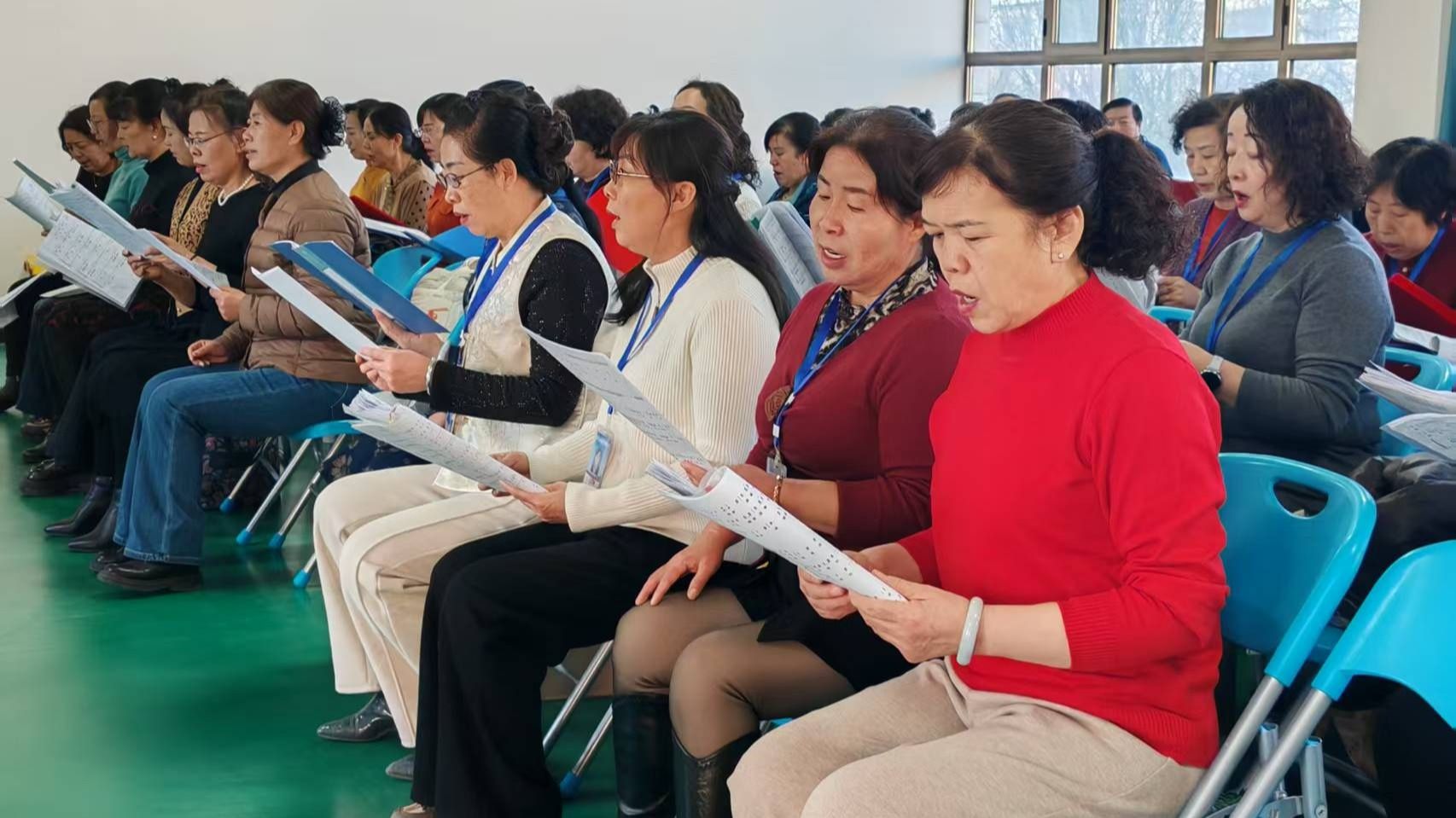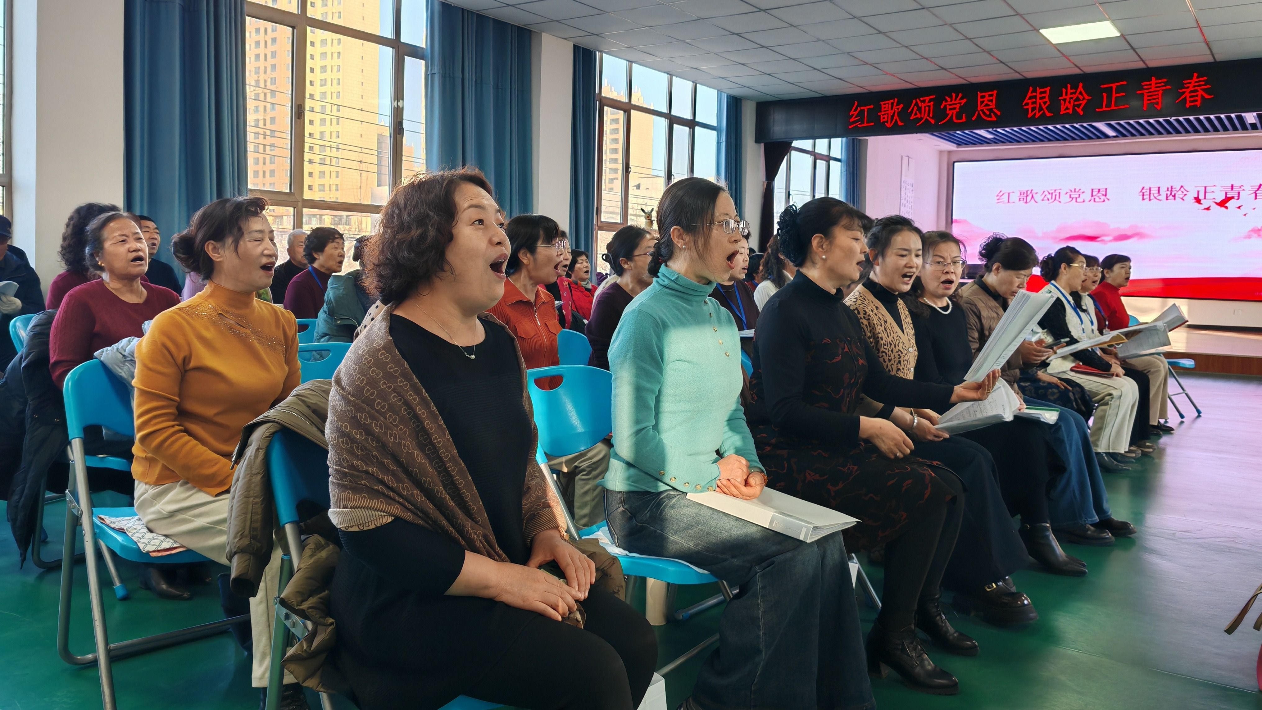 冬日的清晨,阳光刚刚照进景泰县老干部大学,三楼声乐教室就准时奏起了音乐。数十位银发学员挺直腰板,目光灼灼地盯着乐谱,跟着伴奏放声高歌,歌声洪亮整齐,这里正在上演一场别样的“青春”课堂。