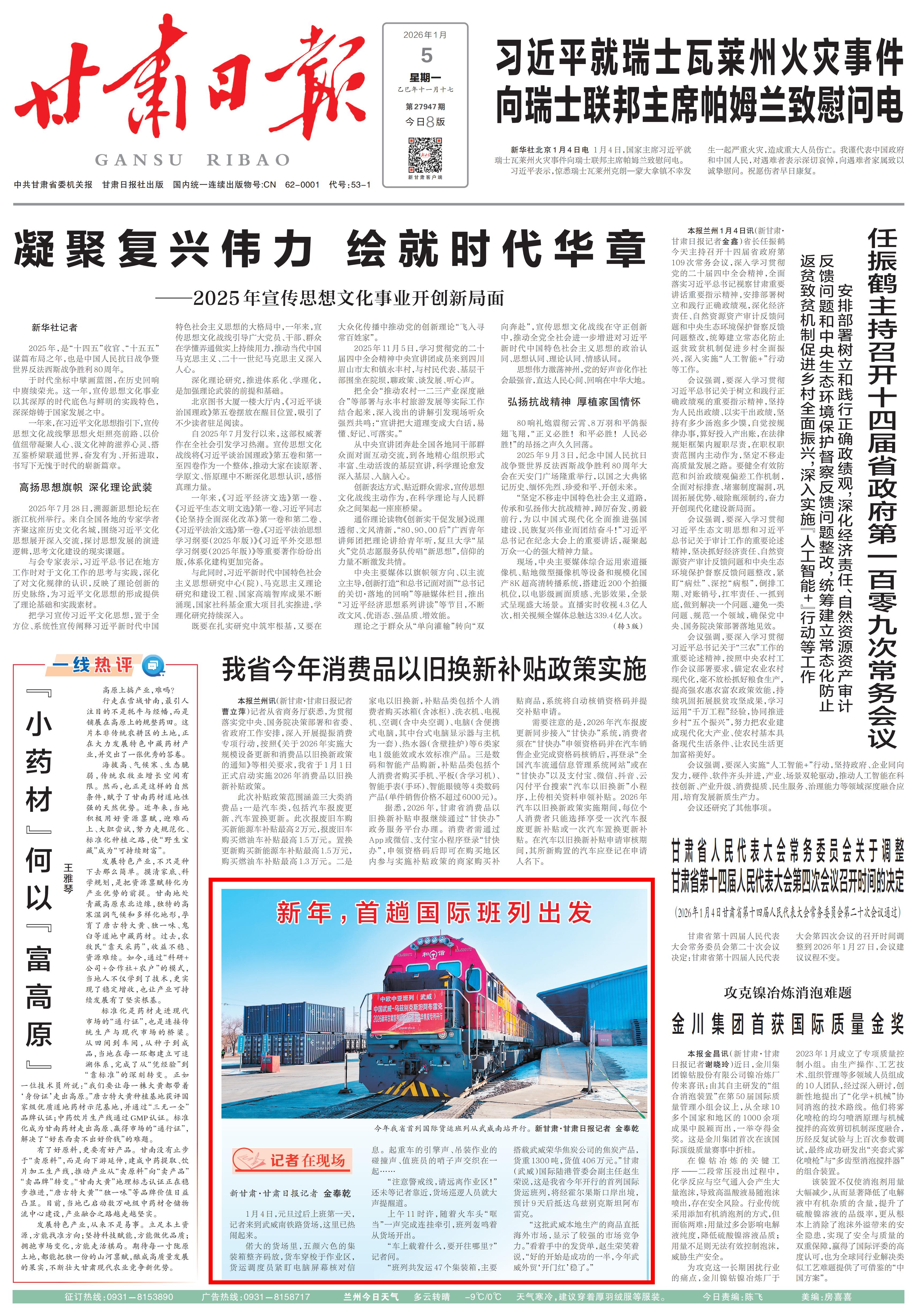 “班列共发运47个集装箱,主要搭载武威荣华焦炭公司的焦炭产品,货重1300吨,货值406万元。”甘肃(武威)国际陆港管委会副主任赵生荣说,这是我省今年开行的首列国际货运班列,将经由霍尔果斯口岸出境,预计9天后抵达乌兹别克斯坦阿布雷克。
