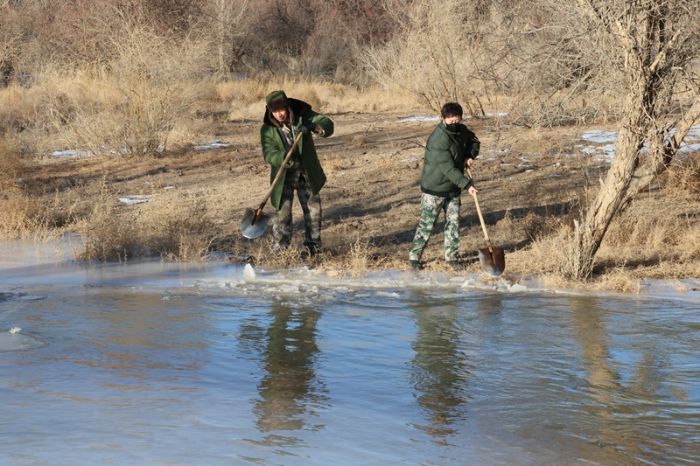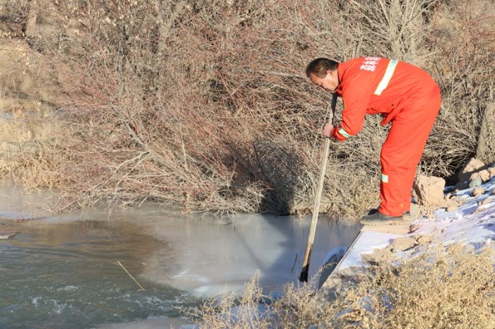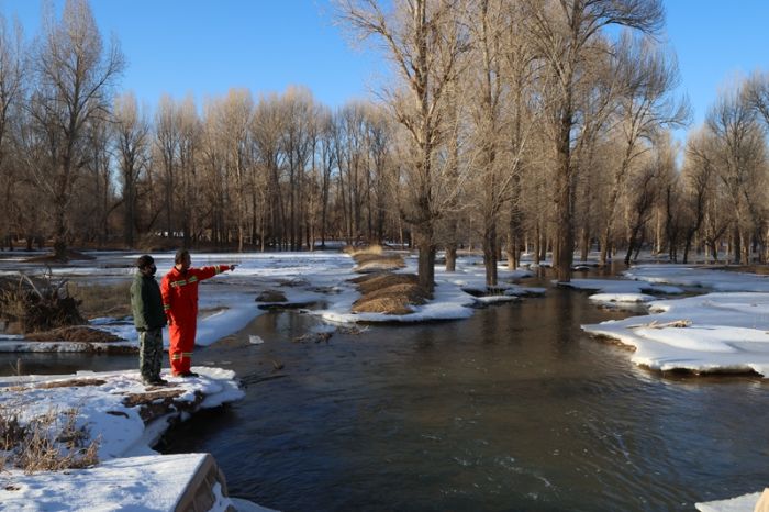 在五泉林场第三管护站灌溉现场,护林员们紧随水流,密切关注水头和闸口,根据水流速度和渗水深度,适时调整水量,确保林区每一棵树木都得到充分的冬水滋养。