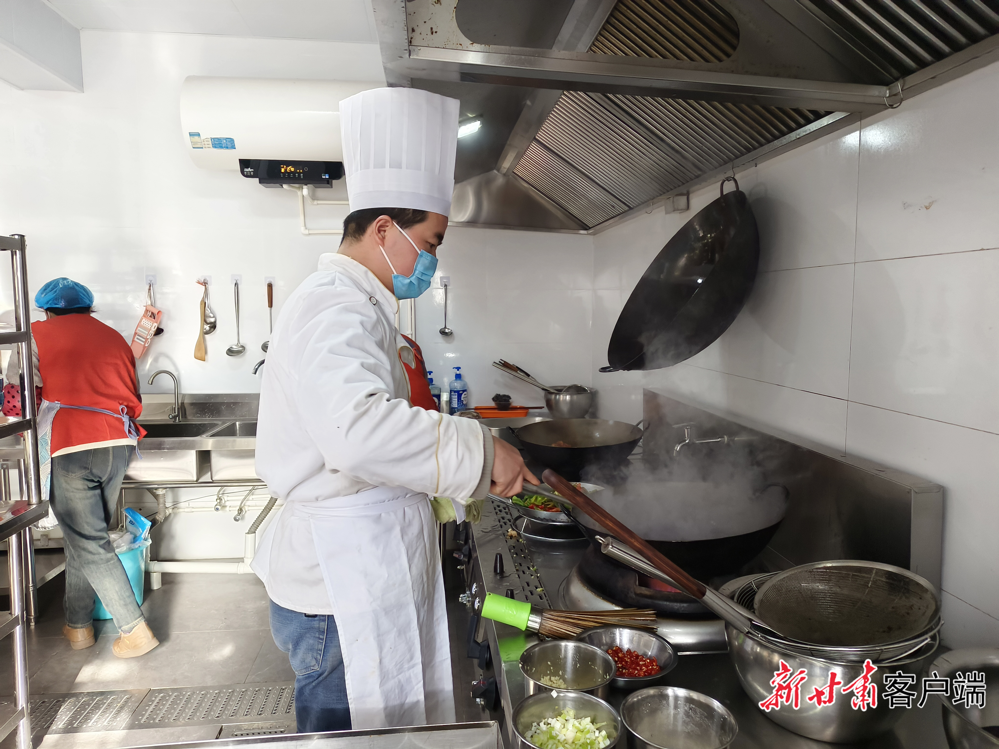 清晨的阳光透过窗棂,落在泾川县东街社区一间六七十平方米的小屋里。后厨传来锅铲碰撞的清脆声响,几位厨师正有条不紊地忙活着,为即将到来的午餐做准备。