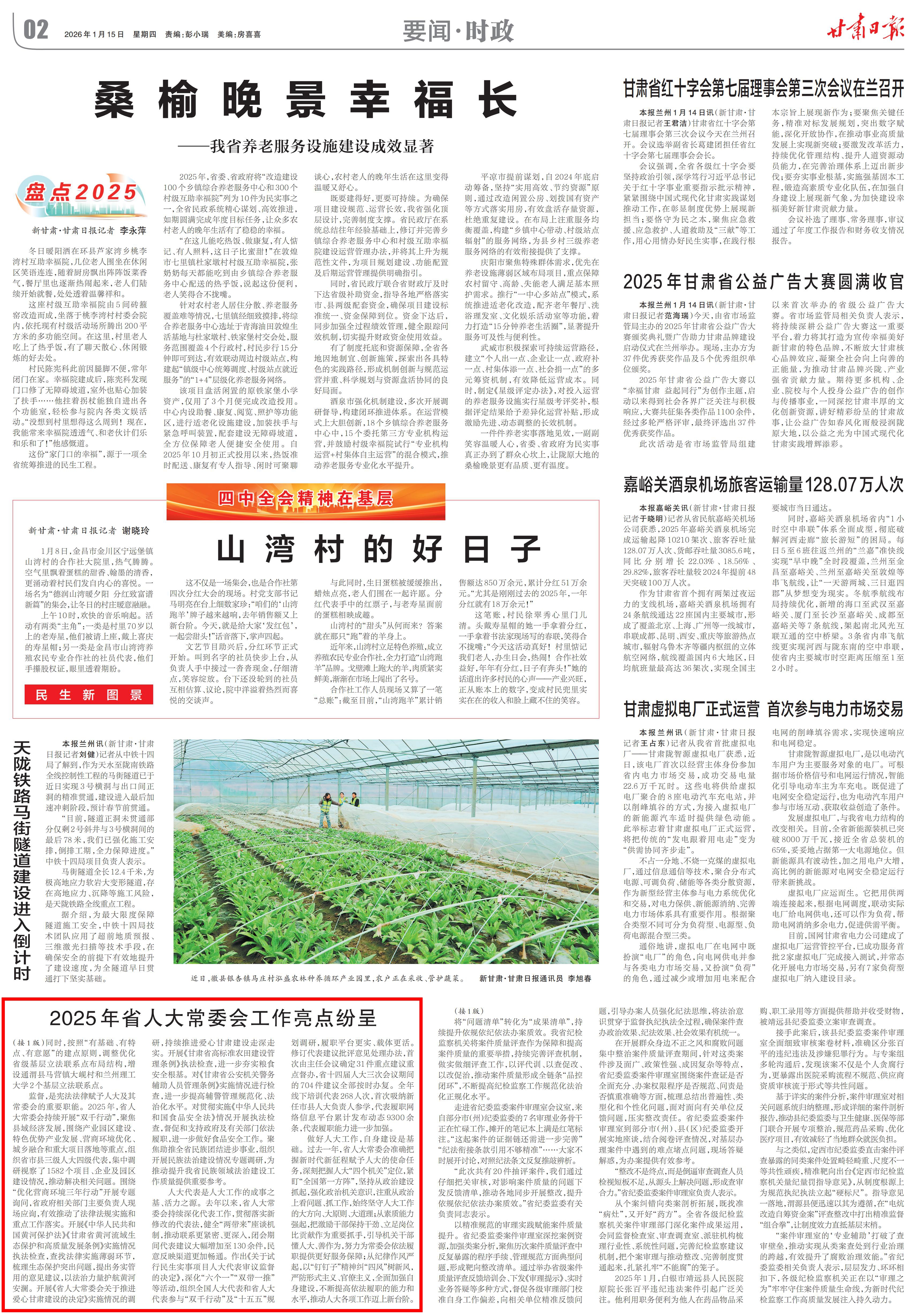 新甘肃客户端兰州1月14日讯(新甘肃·甘肃日报记者 石丹丹)记者从省人大常委会获悉,去年以来,省人大常委会以习近平新时代中国特色社会主义思想为指导,深入领会习近平总书记关于坚持和完善人民代表大会制度的重要思想,坚持党的领导、人民当家作主、依法治国有机统一,不断提升立法质效,着力增强监督实效,充分发挥代表作用,强化“四个机关”建设,推动党中央决策部署和省委工作安排落地见效,为奋力谱写中国式现代化甘肃篇章贡献了人大智慧和力量。