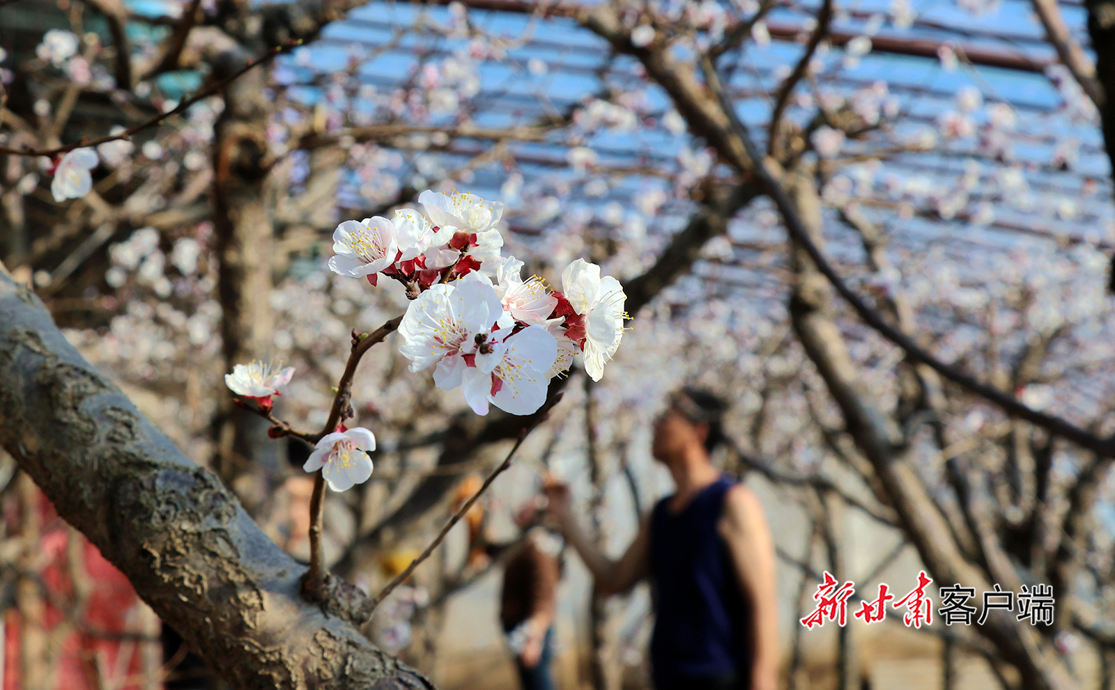 1月11日,静宁县城川镇靳寺村的温室大棚内杏花竞相绽放,果农忙着为杏花进行授粉。新甘肃·甘肃日报通讯员 王 毅
