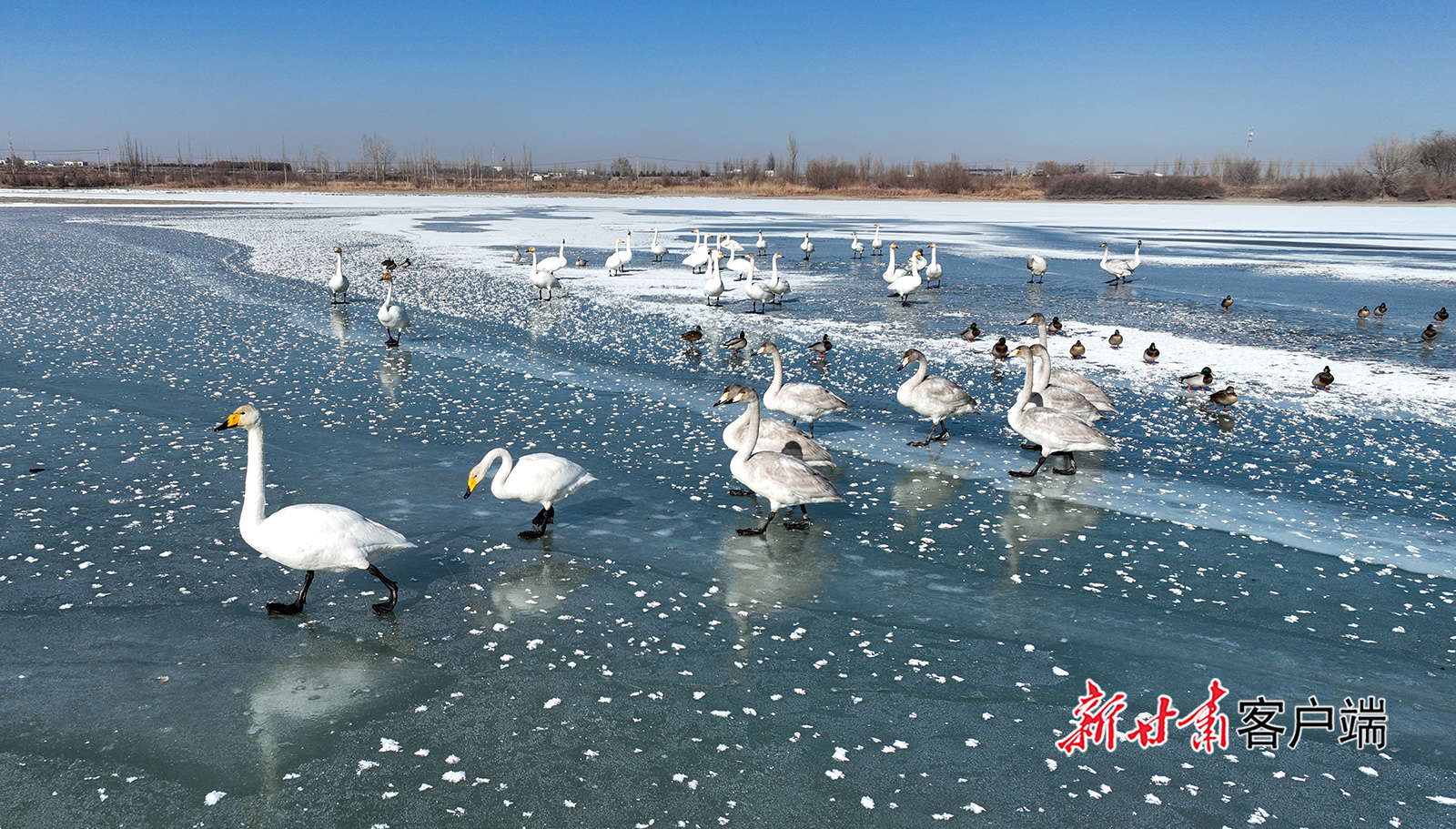 1月10日,成群的天鹅、绿头鸭、赤麻鸭等候鸟在酒泉市肃州区魏家湾水库栖息、觅食。新甘肃·甘肃日报通讯员 曹红祖