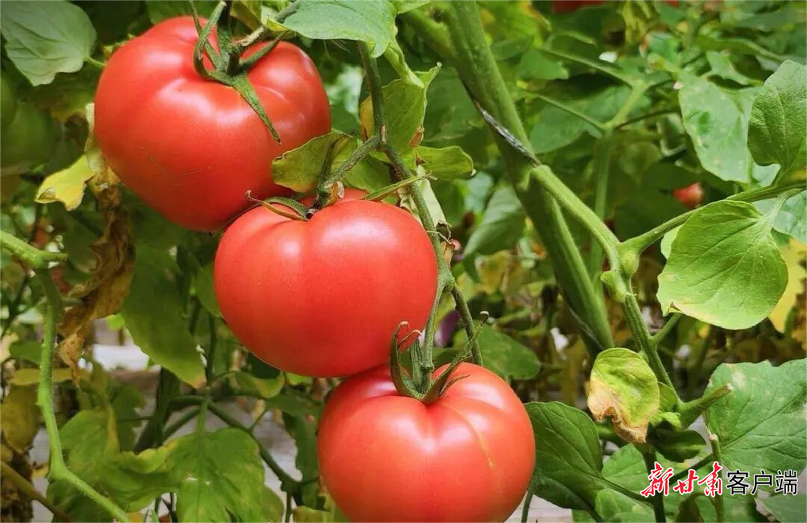 在新堡乡兴民新村种植户柳清林家的温室大棚,翠绿繁茂的藤蔓间,红彤彤的西红柿饱满圆润、色泽鲜亮,密密麻麻缀满枝头。
